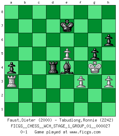 Last move : 0-1 2023 September 6 7:48:26 [Event "FICGS__CHESS__WCH_STAGE_1_GROUP_01__000027"] [Site "FICGS"] [Date "2023.07.04"] [Round "1"] [White "Faust,Dieter"] [Black "Tabudlong,Ronnie"] [Result "0-1"] [WhiteElo "2000"] [BlackElo "2242"] 1.d4 d5 2.c4 e6 3.Nc3 Nf6 4.Bg5 Be7 5.Nf3 h6 6.Bxf6 Bxf6 7.e3 O-O 8.Rc1 c6 9.Bd3 Nd7 10.O-O dxc4 11.Bxc4 e5 12.Ne4 exd4 13.Nxd4 c5 14.Nf5 Ne5 15.Nfd6 Nxc4 16.Rxc4 Bxb2 17.Rxc5 Be6 18.Rb5 Ba3 19.Rxb7 a5 20.Qd4 Bxa2 21.Ra1 Bxd6 22.Nxd6 Be6 23.e4 a4 24.Ra3 Ra6 25.e5 Qa8 26.Rb4 Bb3 27.h3 Rb8 28.Kh2 Rxb4 29.Qxb4 Qd5 30.f4 Ra8 31.Qc3 f6 32.Nf5 Qe4 33.Qf3 Qxf3 34.gxf3 Rd8 35.Nd6 Kf8 36.Kg3 Ke7 37.Ne4 fxe5 38.fxe5 Rd5 39.Nc3 Rd4 40.Ne4 Rd5 41.Nc3 Rd4 42.Ne4 Bc2 43.Kf4 g5+ 44.Kg4 Bxe4 0-1 Follow this game move after move (download)Chess is a forcing house where the fruits of character can ripen more fully than in life. (Edward Morgan Foster) Über Kasparov: Es ist offensichtlich, daß er in einem totalitären Staat aufwuchs und deshalb zu diktatorischen Zügen neigt. (Viktor Kortschnoi) Aquel que teme a un Peón de Reina aislado, debería de retirarse del Ajedrez. (Siegbert Tarrasch) Les réformistes prétendent que les progrès de la théorie conduiront à la disparition des échecs, et qu'il faut, pour leur rendre vie, en remanier les règles. En réalité, qu'exprime cette affirmation? Le mépris de l'intuition, de l'imagination et de tous les autres éléments qui font des échecs un art. (Alexander Alekhine) The Internet is the world's largest library. It's just that all the books are on the floor. (John Allen Paulos)
