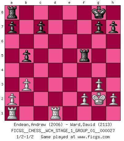 Last move : 1/2-1/2 2023 July 30 19:54:45 [Event "FICGS__CHESS__WCH_STAGE_1_GROUP_01__000027"] [Site "FICGS"] [Date "2023.07.04"] [Round "1"] [White "Endean,Andrew"] [Black "Ward,David"] [Result "1/2-1/2"] [WhiteElo "2006"] [BlackElo "2113"] 1.d4 Nf6 2.c4 e6 3.Nf3 b6 4.g3 Ba6 5.b3 d5 6.Bg2 dxc4 7.Ne5 Bb4+ 8.Kf1 Bd6 9.Nxc4 Nd5 10.e4 Ne7 11.Bb2 Nbc6 12.Nbd2 O-O 13.Kg1 b5 14.Ne3 e5 15.dxe5 Bxe5 16.Bxe5 Nxe5 17.Nf3 Nxf3+ 18.Bxf3 Bb7 19.Kg2 f5 20.Qc2 Qd4 21.Rhd1 Qe5 22.exf5 Bxf3+ 23.Kxf3 Nxf5 24.Nxf5 Qxf5+ 25.Qxf5 Rxf5+ 26.Kg2 1/2-1/2 Follow this game move after move (download)The most important feature of the Chess position is the activity of the pieces. This is absolutely fundamental in all phases of the game: Opening, Middlegame and especially Endgame. The primary constraint on a piece's activity is the Pawn structure. (Michael Stean) Der vorletzte Fehler gewinnt. (Savielly Grigorievitsch Tartakower) No soy una persona materialista y por eso, no resiento la falta o pérdida del dinero. La ausencia de cosas mundanas carece de importancia. Ya que el Ajedrez es una forma en la que puedo ser tan materialista como yo desee sin tener la necesidad de vender mi alma. (Jamie Walter Adams) Le temps de noter son nom sur la feuille de partie, j'étais déjà en zeitnot ! D'un modeste amateur apparié lors de la première ronde d'un open contre le grand-maître Azmaïparashvili. Mandala - that's it! 16x16 squares as multiple of the four and the eight because of the Four Noble Truths and the Noble Eightfold Path. (Heinz-Georg Lehnhoff about Big Chess)