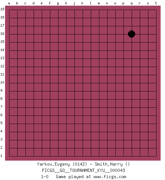 Last move : 1-0 2007 September 3 6:19:47 [Event "FICGS__GO__TOURNAMENT_KYU__000043"] [Site "FICGS"] [Date "2007.09.02"] [Round "1"] [Black "Yarkov,Evgeny"] [White "Smith,Harry"] [Result "1-0"] [Rating 1 "0142"] 1.q16 1-0 Here are the names of the openings (joseki) played in the four corners : Player Black won this Go (weiqi, baduk) game. Follow this game move after move (download)Answer the keima with a kosumi. (Anonymous) Begin at the beginning and go on till you come to the end; then stop. (Lewis Carrol, Alice in Wonderland)