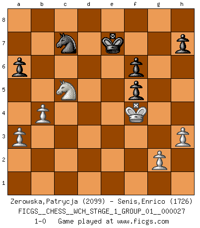 Last move : 1-0 2023 August 27 17:13:42 [Event "FICGS__CHESS__WCH_STAGE_1_GROUP_01__000027"] [Site "FICGS"] [Date "2023.07.04"] [Round "1"] [White "Zerowska,Patrycja"] [Black "Senis,Enrico"] [Result "1-0"] [WhiteElo "2099"] [BlackElo "1726"] 1.e4 c5 2.Nf3 Nc6 3.Bb5 g6 4.O-O Bg7 5.Bxc6 bxc6 6.Re1 e5 7.c3 Ne7 8.d4 cxd4 9.cxd4 exd4 10.Nxd4 O-O 11.Nc3 Rb8 12.Nb3 Qc7 13.Be3 Rd8 14.Bd4 Be5 15.Bxe5 Qxe5 16.Qd2 d6 17.f4 Qg7 18.e5 Bf5 19.Rad1 Bg4 20.exd6 Nd5 21.Rc1 Rxd6 22.Ne4 R6d8 23.Rxc6 Be6 24.h3 Qf8 25.Nd4 Bf5 26.a3 Bxe4 27.Rxe4 Rb7 28.Qe2 Rbd7 29.Nf3 Ne7 30.Rc1 Nf5 31.Qe1 Qd6 32.Kh2 Rc7 33.Rxc7 Qxc7 34.Re8+ Kg7 35.Rxd8 Qxd8 36.Qc3+ Qf6 37.Qe5 Qxe5 38.Nxe5 Nd4 39.Kg3 f6 40.Nd3 Nb3 41.f5 gxf5 42.Kf4 Kg6 43.Ne1 Nd2 44.b4 Nb1 45.Nc2 Nc3 46.Kf3 a6 47.Nd4 Nd5 48.Ne6 Kf7 49.Nc5 Nc7 50.Ke3 Ke7 51.Kf4 1-0 Follow this game move after move (download)It's always better to sacrifice your opponent's men. (Savielly Tartakover) Wer wird heute Abend ihr Gegner sein? -- Heute Abend spiele ich gegen die schwarzen Steine. (Akiba Rubinstein) El Ajedrez es como la guerra en un tablero. (Bobby Fischer) Mais l'homme est une créature légère et illogique : semblable au joueur d'échecs, il n'aime que le processus du but à atteindre, non le but lui-même. (Dostoïevsky) Nobody is always a winner, and anybody who says he is, is either a liar or doesn't play poker. (Amarillo Slim)