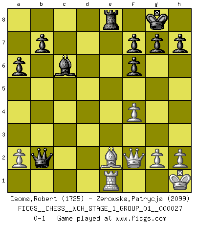 Last move : 0-1 2023 September 1 23:23:38 [Event "FICGS__CHESS__WCH_STAGE_1_GROUP_01__000027"] [Site "FICGS"] [Date "2023.07.04"] [Round "1"] [White "Csoma,Robert"] [Black "Zerowska,Patrycja"] [Result "0-1"] [WhiteElo "1725"] [BlackElo "2099"] 1.e4 c6 2.d4 d5 3.Nc3 dxe4 4.Nxe4 Nf6 5.Nxf6+ exf6 6.Nf3 Bd6 7.Be2 O-O 8.O-O Be6 9.Be3 Nd7 10.c4 Re8 11.Qd2 Nf8 12.Kh1 Ng6 13.d5 cxd5 14.cxd5 Bf5 15.Nd4 Be4 16.Nb5 a6 17.Nxd6 Qxd6 18.Rfd1 Re5 19.Bc4 Rh5 20.f4 Nh4 21.Bf1 Rxd5 22.Qe2 Nf5 23.Rxd5 Bxd5 24.Qd3 Nxe3 25.Qxe3 Bc6 26.Be2 Re8 27.Qf2 Qd2 28.Re1 Qxb2 0-1 Follow this game move after move (download)You are for me the Queen on d8 and I am the Pawn on d7 !! (Eduard Gufeld) Ein Teil des Fehlers ist immer korrekt. (Savielly Grigorievitsch Tartakower) Yo no creo en la psicología. Yo creo en las buenas movidas. (Bobby Fischer) Karpov est une pièce de musée. (Garry Kasparov) Luck has a peculiar habit of favoring those who don't depend on it. (Author unknown)