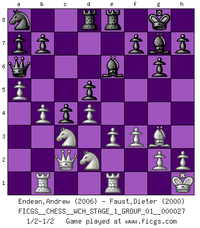 Last move : 1/2-1/2 2023 August 12 8:29:21 [Event "FICGS__CHESS__WCH_STAGE_1_GROUP_01__000027"] [Site "FICGS"] [Date "2023.07.04"] [Round "1"] [White "Endean,Andrew"] [Black "Faust,Dieter"] [Result "1/2-1/2"] [WhiteElo "2006"] [BlackElo "2000"] 1.d4 e6 2.c4 Nf6 3.Nf3 d5 4.Nc3 Bb4 5.Bg5 Nbd7 6.cxd5 exd5 7.e3 c5 8.Bd3 c4 9.Bf5 Qa5 10.Qc2 O-O 11.O-O Re8 12.Nd2 g6 13.Bxd7 Nxd7 14.f3 Bf8 15.a3 Nb6 16.b4 Qa6 17.Bf4 Be6 18.Kh1 Rad8 19.Bg3 Bg7 20.a4 Na8 21.Rab1 Qb6 22.a5 Qa6 23.Rfe1 1/2-1/2 Follow this game move after move (download)The game of chess is the touchstone of the intellect. (Goethe) Es war undenkbar für die Behörden, dass ein sowjetischer Großmeister auf diese Art und Weise [Fischer-Taimanov 6:0] verliert, ohne dass es eine politischer Erklärung dafür gäbe. (Mark Taimanov) Cualquier cambio de material en una posición debe venir por medio de un mate, una captura o promoción de Peón. (Purdy) La vie est comme un jeu d'échecs : nous esquissons un plan, mais celui-ci est tributaire de ce que daignent faire l'adversaire aux échecs et le destin dans la vie. (Arthur Schopenhauer) A person who never made a mistake never tried anything new. (Albert Einstein)