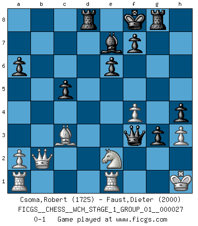 Last move : 0-1 2023 September 12 20:36:14 [Event "FICGS__CHESS__WCH_STAGE_1_GROUP_01__000027"] [Site "FICGS"] [Date "2023.07.04"] [Round "1"] [White "Csoma,Robert"] [Black "Faust,Dieter"] [Result "0-1"] [WhiteElo "1725"] [BlackElo "2000"] 1.e4 e6 2.d4 d5 3.Nc3 Nf6 4.e5 Nfd7 5.Nf3 c5 6.Bb5 a6 7.Bxd7+ Bxd7 8.O-O cxd4 9.Nxd4 Nc6 10.Nxc6 bxc6 11.Be3 c5 12.Bf4 Be7 13.Qg4 Kf8 14.Ne2 h5 15.Qg3 h4 16.Qh3 Qb8 17.b3 g5 18.Bd2 Qxe5 19.Rfe1 Rg8 20.Qd3 Bb5 21.c4 dxc4 22.bxc4 Rd8 23.Qc2 Bxc4 24.Bc3 Qf5 25.Qb2 Bd5 26.f3 g4 27.f4 g3 28.h3 Bxg2 29.Kxg2 Qe4+ 30.Kg1 Qe3+ 31.Kh1 Qf3+ 0-1 Follow this game move after move (download)I like to say that Bobby Fischer was the greatest player ever. But what made Fischer a genius was his ability to blend an American freshness and pragmatism with Russian ideas about strategy. (Bruce Pandolfini) Jeder leidlich begabte Spieler, er braucht keineswegs hervorragend veranlagt zu sein, kann es zum Meister bringen. Aber das ist ja auch gar nicht nötig! Der richtige Standpunkt ist es, zu seinem Vergnügen zu spielen, und man glaube ja nicht, dass der Genuss proportional dem Können sei. (Siegbert Tarrasch) Si yo gano un torneo, yo lo gano por mí mismo. Yo hago las jugadas. Nadie me ayuda. (Bobby Fischer) Que feriez-vous si vous étiez en train de jouer aux échecs et que la fin du monde arrive ? Je continuerais à jouer. (Saint Borromée) 98% of all statistics are made up. (Author unknown)