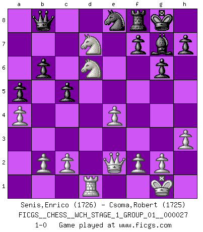 Last move : 1-0 2023 August 25 23:31:37 [Event "FICGS__CHESS__WCH_STAGE_1_GROUP_01__000027"] [Site "FICGS"] [Date "2023.07.04"] [Round "1"] [White "Senis,Enrico"] [Black "Csoma,Robert"] [Result "1-0"] [WhiteElo "1726"] [BlackElo "1725"] 1.d4 d6 2.e4 Nf6 3.Nc3 c6 4.Nf3 g6 5.Be3 Bg7 6.h3 O-O 7.a4 b6 8.Be2 a5 9.Qd2 Ba6 10.O-O Bxe2 11.Qxe2 Qc7 12.Rad1 e5 13.d5 Nbd7 14.dxc6 Qxc6 15.Rd3 Nc5 16.Bxc5 dxc5 17.Rfd1 Qc7 18.Rd6 Rad8 19.Nb5 Qb8 20.Nxe5 Rxd6 21.Nxd6 Ne8 22.Nd7 1-0 Follow this game move after move (download)In complicated positions, Bobby Fischer hardly had to be afraid of anybody. (Paul Keres) Je mehr ich von der FIDE weiss, um so weniger verstehe ich. (Alexander Kalifman) El Peón aislado arroja penumbra sobre todo el tablero. (Aaron Nimzovich) Aux échecs, les retours au sommet sont rares : les dommages psychologiques consécutifs à une défaite sont trop sévères. (Daily Telegraph) Chess is everything: art, science and sport. (Anatoly Karpov)
