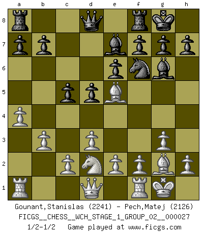 Last move : 1/2-1/2 2023 September 28 13:52:19 [Event "FICGS__CHESS__WCH_STAGE_1_GROUP_02__000027"] [Site "FICGS"] [Date "2023.07.04"] [Round "1"] [White "Gounant,Stanislas"] [Black "Pech,Matej"] [Result "1/2-1/2"] [WhiteElo "2241"] [BlackElo "2126"] 1.b3 d5 2.Bb2 Nf6 3.Nf3 Bf5 4.g3 c5 5.Bg2 Nc6 6.O-O e6 7.d3 Be7 8.Nbd2 O-O 9.Ne5 Nxe5 10.Bxe5 Bg6 11.a4 1/2-1/2 Follow this game move after move (download)I prefer to lose a really good game than to win a bad one. (David Levy) Schach ist ein schwarz-weisser Dschungel. (Garry Kasparov) ¿Cual es el objetivo de jugar una apertura de gambito?... Para adquirir una reputación de ser un jugador apuesto a costo de perder el juego. (Siegbert Tarrasch) Les ravages du H expliquent la différence de niveau entre Tal et Thal [Abergel]. Wisdom begins at the end. (Daniel Webster)