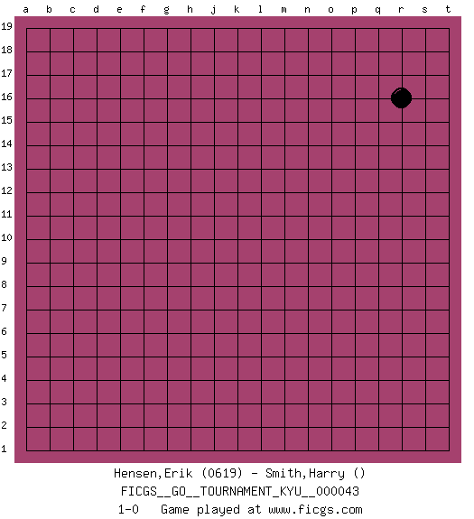 Last move : 1-0 2007 September 3 6:19:28 [Event "FICGS__GO__TOURNAMENT_KYU__000043"] [Site "FICGS"] [Date "2007.09.02"] [Round "1"] [Black "Hensen,Erik"] [White "Smith,Harry"] [Result "1-0"] [Rating 1 "0619"] 1.r16 1-0 Here are the names of the openings (joseki) played in the four corners : Player Black won this Go (weiqi, baduk) game. Follow this game move after move (download)In an unreasonable situation, an unreasonable move is reasonable. (Tamino) He who fights with monsters should be careful lest he thereby become a monster. (Friedrich Nietzsche, Beyond Good and Evil)
