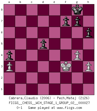Last move : 0-1 2023 September 16 19:52:4 [Event "FICGS__CHESS__WCH_STAGE_1_GROUP_02__000027"] [Site "FICGS"] [Date "2023.07.04"] [Round "1"] [White "Cabrera,Claudio"] [Black "Pech,Matej"] [Result "0-1"] [WhiteElo "2006"] [BlackElo "2126"] 1.c4 e5 2.g3 Nf6 3.Nc3 Bb4 4.Bg2 O-O 5.Nf3 d6 6.O-O Nc6 7.d3 h6 8.Nd2 Bg4 9.h3 Bh5 10.Nd5 Nxd5 11.cxd5 Ne7 12.Nb3 a5 13.a3 Bc5 14.Nxc5 dxc5 15.f4 exf4 16.g4 Bg6 17.Qb3 c6 18.dxc6 bxc6 19.Qc4 Rb8 20.Bxf4 Rxb2 21.e4 Bh7 22.Qc3 Qb6 23.Bd6 c4 24.Kh1 cxd3 25.Bxe7 Rxg2 26.Kxg2 Bxe4+ 27.Rf3 Qe3 28.Raf1 Bxf3+ 29.Rxf3 Qe2+ 30.Rf2 Qxe7 31.Qxd3 Re8 32.Qc3 Qc7 33.Rf5 a4 34.Qc4 Qd7 35.Rf4 Re3 36.Rf3 Rxf3 37.Kxf3 Qd5+ 38.Qxd5 cxd5 0-1 Follow this game move after move (download)Chess is in its essence a game, in its form an art, and in its execution a science. (Baron Tassilo) Ein Schachspiel besteht aus drei Phasen: Die erste, wenn du hofftst den Vorteil zu haben, die zweite, wenn du glaubst einen Vorteil zu haben, und die dritte.... wenn du weißt Du wirst verlieren. (Savielly Grigorievitsch Tartakower) En el Ajedrez, tal como en la vida, las bendiciones de hoy pueden ser el veneno del mañana. (Assaic) Je fais ceci parce que dans cinquante coups j'obtiendrai cela; je m'appelle Mikhail Moisevitch Botvinnik. (Botvinnik) It's not the size of the dog in the fight, it's the size of the fight in the dog. (Mark Twain)