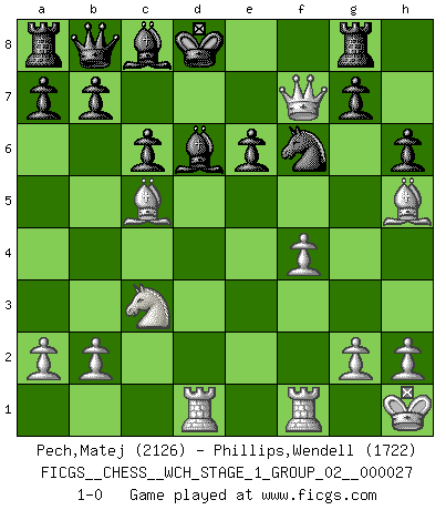 Last move : 1-0 2023 August 25 15:59:40 [Event "FICGS__CHESS__WCH_STAGE_1_GROUP_02__000027"] [Site "FICGS"] [Date "2023.07.04"] [Round "1"] [White "Pech,Matej"] [Black "Phillips,Wendell"] [Result "1-0"] [WhiteElo "2126"] [BlackElo "1722"] 1.c4 d6 2.d4 Nd7 3.Nf3 e5 4.Nc3 c6 5.e4 Be7 6.Be2 h6 7.O-O Qc7 8.Be3 Nf8 9.c5 Ng6 10.cxd6 Bxd6 11.Rc1 Qb8 12.Nxe5 Nxe5 13.dxe5 Bxe5 14.f4 Bc7 15.Kh1 Nf6 16.e5 Nd7 17.e6 fxe6 18.Bh5+ Ke7 19.Qg4 Rg8 20.Qg6 Nf6 21.Qf7+ Kd8 22.Rcd1+ Bd6 23.Bc5 1-0 Follow this game move after move (download)No one ever won a game by resigning. (Unknown) Ich bin Weltmeister und muß mit niemandem irgend etwas diskutieren. (Viswanathan Anand) Por la belleza de sus partidas, la claridad de su juego y lo brillante de sus ideas, Fischer se creó el mismo como un artista de la misma estatura como Brahms, Rembrandt y Shakespeare. (David Levy) Les Echecs ne sont pas pour les âmes timides. Ils requièrent un homme entier, qui ne s'arrête pas aveuglément à ce qui a été déjà établi, mais qui tente individuellement de sonder les profondeurs du jeu. (W. Steinitz) The Movers & Shakers of this world are those who play chess in the mornings and go to the disco in the evenings. (Dinesh De Silva)