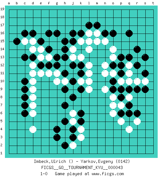 Last move : 1-0 2007 December 20 6:1:10 [Event "FICGS__GO__TOURNAMENT_KYU__000043"] [Site "FICGS"] [Date "2007.09.02"] [Round "1"] [Black "Imbeck,Ulrich"] [White "Yarkov,Evgeny"] [Result "1-0"] [Rating 2 "0142"] 1.q16 d4 2.d16 q4 3.c6 d6 4.c8 d7 5.c7 d8 6.c10 k10 7.r6 q10 8.r9 r10 9.s9 r5 10.q6 p5 11.p6 o6 12.p8 o8 13.o9 o7 14.p9 n9 15.r12 p10 16.o10 o11 17.p11 q11 18.p12 q12 19.q13 r13 20.o12 n11 21.s13 o13 22.p13 q8 23.q9 s10 24.s11 o14 25.o16 n12 26.r14 n15 27.n16 m15 28.k16 m16 29.l17 l16 30.m17 k15 31.j16 d15 32.c16 c15 33.f16 f15 34.g16 g15 35.j15 j14 36.k14 l15 37.h14 j13 38.h15 p7 39.q7 g14 40.h13 h12 41.g13 f13 42.g12 g11 43.f12 f11 44.e15 e14 45.f14 e13 46.e12 d12 47.d13 d14 48.c13 d11 49.j12 k13 50.h11 d10 51.b15 e11 52.k12 l14 53.h9 d9 54.c9 l12 55.h7 h10 56.j10 g10 57.k9 l11 58.k11 l10 59.j8 l9 60.h5 h4 61.j4 k4 62.g4 h3 63.j3 j5 64.g3 j2 65.h2 k3 66.k5 j6 67.k6 1-0 Here are the names of the openings (joseki) played in the four corners : Corner d4 : d4 c6 Hoshi (Hwajeom, Seongjeom, Xingwei`) 4-4 Point. The star or hoshi (4-4) point, emphasizing influence at the potential expense of territory. Ikken Kakari (Hankan Keolch'im, Yi Gua`jiao~, 1-Space Low Approach). Black 2 is the standard approach move to the 4-4. Corner q4 : q4 r6 Hoshi (Hwajeom, Seongjeom, Xingwei`) 4-4 Point. The star or hoshi (4-4) point, emphasizing influence at the potential expense of territory. Ikken Kakari (Hankan Keolch'im, Yi Gua`jiao~, 1-Space Low Approach). Black 2 is the standard approach move to the 4-4. Player Black won this Go (weiqi, baduk) game. Follow this game move after move (download)Add one stone, then sacrifice both. (Anonymous) The real voyage of discovery consists not in seeking new lands but in seeing with new eyes. (Marcel Proust)