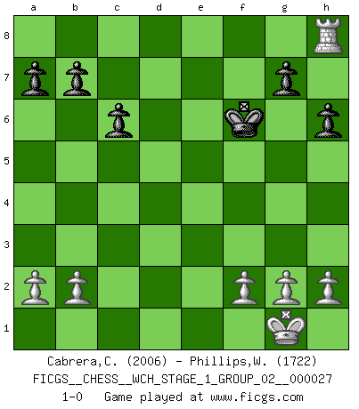 Last move : 1-0 2023 July 5 22:26:42 [Event "FICGS__CHESS__WCH_STAGE_1_GROUP_02__000027"] [Site "FICGS"] [Date "2023.07.04"] [Round "1"] [White "Cabrera,Claudio"] [Black "Phillips,Wendell"] [Result "1-0"] [WhiteElo "2006"] [BlackElo "1722"] 1.Nf3 d6 2.d4 c6 3.c4 Nd7 4.Nc3 e5 5.e4 Be7 6.Be2 h6 7.Be3 Qc7 8.O-O Nf8 9.c5 exd4 10.cxd6 Bxd6 11.Bxd4 Ne6 12.e5 Nxd4 13.exd6 Nxf3+ 14.Bxf3 Qd8 15.Re1+ Be6 16.Bg4 Nf6 17.Bxe6 fxe6 18.Rxe6+ Kf7 19.Re7+ Kg8 20.Qb3+ Kh7 21.Qf7 Qf8 22.Qe6 Re8 23.Qf5+ Kg8 24.Rae1 Rxe7 25.dxe7 Qe8 26.Ne4 Qxe7 27.Nxf6+ Qxf6 28.Re8+ Kf7 29.Qxf6+ Kxf6 30.Rxh8 1-0 Follow this game move after move (download)Chess is above all, a fight ! (Emanuel Lasker) Ja, jede Frau in Holland liebt mich bestimmt, und alle Männer hassen mich. (Loek van Wely) Puntos débiles o agujeros en la posición de tu oponente deben de ser ocupados por piezas, no Peones. (Siegbert Tarrasch) On peut tirer plus d'utilité d'une partie perdue que de 100 parties gagnées. (Capablanca) A computer lets you make more mistakes faster than any invention in human history - with the possible exceptions of handguns and tequila. (Mitch Ratcliffe)