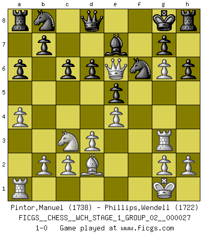 Last move : 1-0 2023 July 8 5:7:44 [Event "FICGS__CHESS__WCH_STAGE_1_GROUP_02__000027"] [Site "FICGS"] [Date "2023.07.04"] [Round "1"] [White "Pintor,Manuel"] [Black "Phillips,Wendell"] [Result "1-0"] [WhiteElo "1738"] [BlackElo "1722"] 1.e4 d6 2.f4 c6 3.Nf3 Qc7 4.Bc4 h6 5.d3 e5 6.O-O Nf6 7.f5 a6 8.a4 Be7 9.Nh4 Nfd7 10.Bxf7+ Kxf7 11.Qh5+ Kg8 12.Ng6 Nf6 13.Qh3 Rh7 14.Nc3 Qd8 15.Rf3 Bd7 16.Rg3 Be8 17.Bd2 Bxg6 18.fxg6 Rh8 19.Qe6+ 1-0 Follow this game move after move (download)Best by test: 1. e4 (Bobby Fischer) Fischer machte Schach einfach zu einer aufregenden Sache, wann immer er sich ans Brett setzte. (Raymond Keene) Todos los Maestros de Ajedrez fueron un día unos principiantes. (Chernev) Il a essayé de se convaincre qu'il pourrait empêcher toutes les erreurs et ne jamais perdre. L'horreur ! Gary Kasparov au sujet de Robert Fischer. There are two types of people in this world, good and bad. The good sleep better, but the bad seem to enjoy the waking hours much more. (Woody Allen)