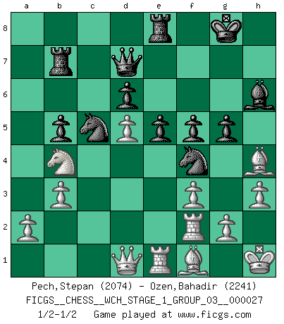 Last move : 1/2-1/2 2023 September 22 12:46:41 [Event "FICGS__CHESS__WCH_STAGE_1_GROUP_03__000027"] [Site "FICGS"] [Date "2023.07.04"] [Round "1"] [White "Pech,Stepan"] [Black "Ozen,Bahadir"] [Result "1/2-1/2"] [WhiteElo "2074"] [BlackElo "2241"] 1.e4 c5 2.Nf3 d6 3.d4 cxd4 4.Nxd4 Nf6 5.Nc3 a6 6.Be3 e5 7.Nb3 Be6 8.f3 h5 9.Qd2 Nbd7 10.Nd5 Bxd5 11.exd5 g6 12.Be2 Bg7 13.O-O b6 14.c4 O-O 15.Rae1 Re8 16.Kh1 Rb8 17.Na1 b5 18.cxb5 axb5 19.Nc2 Rb7 20.b3 Nc5 21.Nb4 Qd7 22.h3 h4 23.Bf2 Nh5 24.Bxh4 Nf4 25.Rf2 Bh6 26.Qd1 f5 27.Bf1 g5 1/2-1/2 Follow this game move after move (download)You must take your opponent into a deep dark forest where 2+2=5, and the path leading out is only wide enough for one. (Mikhail Tal) Schach ist das schnellste Spiel der Welt, weil man in jeder Sekunde Tausende von Gedanken ordnen muß. (Albert Einstein) El Ajedrez es tortura mental. (Garry Kasparov) Le pion, dans sa simplicité, marche droit devant lui, mais lorsqu'il prend, il le fait obliquement? Ainsi l'homme, tant qu'il reste pauvre, marche dans la droiture et vit honnêtement, mais lorsqu'il recherche les honneurs, il flatte, se parjure et, par les voies obliques, cherche une position supérieure sur l'échiquier du monde. (Jean de Galles) Internet: Absolute communication, absolute isolation. (Paul Carvel)