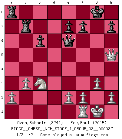 Last move : 1/2-1/2 2023 September 2 8:56:19 [Event "FICGS__CHESS__WCH_STAGE_1_GROUP_03__000027"] [Site "FICGS"] [Date "2023.07.04"] [Round "1"] [White "Ozen,Bahadir"] [Black "Fox,Paul"] [Result "1/2-1/2"] [WhiteElo "2241"] [BlackElo "2015"] 1.Nf3 Nf6 2.c4 g6 3.d4 Bg7 4.g3 O-O 5.Bg2 c5 6.O-O cxd4 7.Nxd4 d5 8.cxd5 Nxd5 9.Nc3 Nb6 10.Ndb5 Nc6 11.Bf4 Bd7 12.Bc7 Qc8 13.Rc1 Bh3 14.Bxh3 Qxh3 15.Nxa7 Nd7 16.Nxc6 bxc6 17.Qd3 Bh6 18.Rcd1 Nf6 19.Qf3 Rfc8 20.Rd4 Rxc7 21.Rh4 Qe6 22.Rxh6 Nh5 23.Rxh5 gxh5 24.Qxh5 Rb7 25.b3 1/2-1/2 Follow this game move after move (download)The King is a fighting piece. Use it ! (Wilhelm Steinitz) Ein Großmeister muß tausende Partien in seinem Kopf speichern, denn diese sind für Ihn, was die Worte der Muttersprache für gewöhnliche Leute sind, oder Noten für Musiker... (Garry Kasparov) La vida es como el Ajedrez, con lucha, competición y eventos buenos y malos. (Benjamin Franklin) Seul un grand joueur sait à quel point il joue faiblement. (Xavier Tartacover) Never was anything great achieved without danger. (Niccolo Machiavelli)