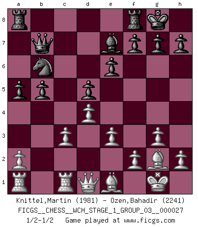 Last move : 1/2-1/2 2023 July 31 12:17:16 [Event "FICGS__CHESS__WCH_STAGE_1_GROUP_03__000027"] [Site "FICGS"] [Date "2023.07.04"] [Round "1"] [White "Knittel,Martin"] [Black "Ozen,Bahadir"] [Result "1/2-1/2"] [WhiteElo "1981"] [BlackElo "2241"] 1.Nf3 d5 2.d4 Nf6 3.c4 e6 4.g3 Bb4+ 5.Bd2 Be7 6.Bg2 O-O 7.O-O c6 8.Qc2 b6 9.Ne5 Bb7 10.Rd1 Nbd7 11.cxd5 cxd5 12.Nc6 Bxc6 13.Qxc6 Qc8 14.Qa4 a6 15.Rc1 Qb7 16.Be1 b5 17.Qd1 a5 18.e3 Ne4 19.Nc3 Nxc3 20.bxc3 Nb6 1/2-1/2 Follow this game move after move (download)Do you realize Fischer almost never has any bad pieces? He exchanges them, and the bad pieces remain with his opponents. (Yuri Balashov) Ich erzeugte keinen Neid, da mich die Schachspieler als Musiker und die Musiker als Schachspieler betrachteten. (Mark Taimanov) Yo siempre he tenido un ligero sentimiento de lástima por una persona que no tiene conocimiento del Ajedrez. (Siegbert Tarrasch) Les Cavaliers se révèlent fort utiles dans les positions fermées. D'habitude, les Fous sont un peu plus forts que les Cavaliers dans les positions ouvertes. Qu'on le veuille ou non, il restera toujours des exceptions ! Go and wake up your luck. (Persian saying)