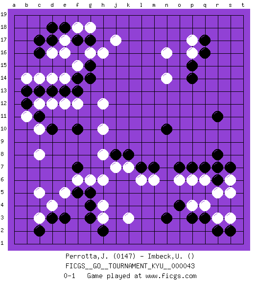 Last move : 0-1 2008 January 9 11:0:14 [Event "FICGS__GO__TOURNAMENT_KYU__000043"] [Site "FICGS"] [Date "2007.09.02"] [Round "1"] [Black "Perrotta,John Zach"] [White "Imbeck,Ulrich"] [Result "0-1"] [Rating 1 "0147"] 1.q16 q4 2.c16 d4 3.n3 k3 4.q3 r3 5.p3 p4 6.o4 q6 7.r11 e17 8.d17 e16 9.d10 p17 10.q17 p16 11.p15 n16 12.p14 c8 13.r8 c12 14.g3 h3 15.d3 c3 16.e3 c5 17.c13 d12 18.f10 f12 19.r6 r5 20.q7 s6 21.r7 n14 22.g17 j17 23.h2 h4 24.g4 h6 25.n10 h10 26.f7 f6 27.s7 s5 28.c2 c14 29.b13 b14 30.b12 b11 31.d13 d14 32.e13 e12 33.f14 d16 34.c17 g16 35.e18 f15 36.g14 f18 37.d18 e14 38.f13 h12 39.f17 g18 40.g15 h16 41.r2 s3 42.s2 p6 43.p7 o6 44.o7 m6 45.m7 l6 46.l7 k7 47.k8 j7 48.j8 h8 49.g5 g6 50.f5 e5 51.c11 c10 0-1 This go game has been lost on time (started : 2007.09.02 10:7:16) Here are the names of the openings (joseki) played in the four corners : Corner q4 : q4 n3 Hoshi (Hwajeom, Seongjeom, Xingwei`) 4-4 Point. The star or hoshi (4-4) point, emphasizing influence at the potential expense of territory. Nikken Kakari (Dukan Keolch'im, E`r Gua`jiao~, 2-Space Low Approach). White typically answers by 7-3 or 3-5 (which is not joseki). Corner d16 : c16 e17 Komoku (Somok, Xiao~mu`) 3-4 Point. The komoku (3-4) point is the traditional corner enclosure move.. Ikken Kakari (Hankan Keolch'im, Yi Gua`jiao~, 1-Space Low Pincer). The small knight move is the basic approach move to the 3-4 point stone. It has been continually used for over four centuries. There are limitless variations, with new moves constantly being discovered. White 2 opens the door to a treaure store of joseki. Player White won this Go (weiqi, baduk) game. Follow this game move after move (download)Go is to western chess what philosophy is to double entry accounting. (from Shibumi, by Trevanian) Perseverance does not equal worthiness. Next time you want to get my attention, wear something fun. Low-riding jeans are hot. (Gregory House, House M.D.)