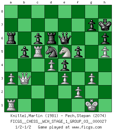 Last move : 1/2-1/2 2023 November 21 1:21:19 [Event "FICGS__CHESS__WCH_STAGE_1_GROUP_03__000027"] [Site "FICGS"] [Date "2023.07.04"] [Round "1"] [White "Knittel,Martin"] [Black "Pech,Stepan"] [Result "1/2-1/2"] [WhiteElo "1981"] [BlackElo "2074"] 1.c4 e5 2.Nc3 Nc6 3.g3 f5 4.Nf3 Nf6 5.d4 e4 6.Nh4 d5 7.Bg5 Bb4 8.e3 O-O 9.Ng2 h6 10.Bxf6 Rxf6 11.h4 Ne7 12.Qb3 a5 13.a3 Bxc3+ 14.Qxc3 dxc4 15.Bxc4+ Be6 16.Nf4 Bxc4 17.Qxc4+ Kh7 18.Kf1 Rc6 19.Qf7 Rf6 20.Qc4 Rc6 21.Qf7 Rf6 22.Qa2 Ng6 23.Nh3 Qd7 24.Rc1 c6 25.Qc4 Ne7 26.Ng5+ Kh8 27.Nf7+ Kh7 28.Ne5 Qe8 29.h5 Nd5 30.Kg2 a4 31.b4 axb3 32.Qxb3 b5 33.Rc2 Ra6 34.Rc5 Qg8 35.Rb1 Rd6 36.Kg1 Qe6 37.Kg2 Qg8 38.Kg1 Qe6 39.Ra1 Qg8 40.Re1 Qe6 41.Rb1 Qg8 42.Ra1 Qe6 43.Rb1 Qg8 44.Ra1 Qe6 1/2-1/2 Follow this game move after move (download)The passed pawn is a criminal, who should be kept under lock and key. Mild measures, such as police surveillance, are not sufficient. (Nimzovitch) Ich glaube, ich kenne inzwischen die Gründe für mein Versagen: schachliche Charakterfehler. Ich war nie ein Wunderkind und in meiner gesamten menschlichen Entwicklung immer zu langsam. (Viktor Kortschnoi) El Ajedrez es una guerra en un tablero. El objetivo es aplastar la mente del oponente. (Bobby Fischer) Shah mat. Le roi est mort. Cri de fierté d'un joueur venant de terrasser son adversaire, courtoisement, sans effusion de sang. Train yourself to let go of everything you fear to lose. (Master Yoda in Star Wars ep.3)