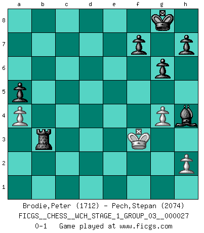 Last move : 0-1 2023 November 21 19:43:48 [Event "FICGS__CHESS__WCH_STAGE_1_GROUP_03__000027"] [Site "FICGS"] [Date "2023.07.04"] [Round "1"] [White "Brodie,Peter"] [Black "Pech,Stepan"] [Result "0-1"] [WhiteElo "1712"] [BlackElo "2074"] 1.d4 Nf6 2.Nf3 g6 3.c4 Bg7 4.Nc3 d5 5.e3 O-O 6.Be2 c5 7.O-O cxd4 8.exd4 Nc6 9.Ne5 Be6 10.c5 Nxe5 11.dxe5 Nd7 12.Nxd5 Nxe5 13.Nf4 Bf5 14.Be3 Nc6 15.Qb3 Nd4 16.Bxd4 Bxd4 17.Rad1 e5 18.Nd5 Be6 19.Bc4 Rc8 20.Qxb7 Rb8 21.Qc6 Rc8 22.Qb7 Rb8 23.Qe7 Bxd5 24.Qxd8 Rfxd8 25.Bxd5 Rxd5 26.c6 Rc8 27.b3 Rc5 28.Rd2 R5xc6 29.R2d1 Rc2 30.a4 Rb2 31.Rb1 Bxf2+ 32.Kh1 Rbc2 33.g3 e4 34.Kg2 Bd4 35.Kh3 e3 36.Rfe1 Re8 37.g4 Be5 38.Rh1 Rf2 39.Rbf1 Rxf1 40.Rxf1 e2 41.Re1 Bc3 42.Rc1 e1Q 43.Rxe1 Bxe1 44.Kg2 a5 45.Kf3 Rb8 46.Ke2 Bh4 47.Kf3 Rxb3+ 0-1 Follow this game move after move (download)Those who say they understand Chess, understand nothing. (Robert Hubner) Ich habe Kasparov in Rente geschickt. (Veselin Topalov) Todos los Maestros de Ajedrez fueron un día unos principiantes. (Chernev) Roi des jeux et jeu des rois, les échecs portent en eux un sentiment d'infini. Ils donnent à celui qui s'est efforcé d'en approfondir les arcanes l'impression de n'être pas à la mesure de l'homme; en fait, ils constituent un résumé de l'univers, un microcosme, et figurent cette grande échelle qui, dans les plans de la lumière descend jusqu'à la matière, qui des abîmes insondables remonte jusqu'en l'infini de Dieu. (Pyrame) However beautiful the strategy, you should occasionally look at the results. (Winston Churchill)