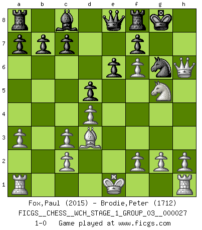Last move : 1-0 2023 August 23 22:57:4 [Event "FICGS__CHESS__WCH_STAGE_1_GROUP_03__000027"] [Site "FICGS"] [Date "2023.07.04"] [Round "1"] [White "Fox,Paul"] [Black "Brodie,Peter"] [Result "1-0"] [WhiteElo "2015"] [BlackElo "1712"] 1.e4 e6 2.d4 d5 3.Nc3 Bb4 4.e5 Ne7 5.a3 Bxc3+ 6.bxc3 O-O 7.Bd3 Nd7 8.Qh5 Ng6 9.Nh3 Qe8 10.Ng5 h6 11.Nf3 Ne7 12.Bxh6 gxh6 13.Qxh6 Ng6 14.Ng5 Nf6 15.exf6 1-0 Follow this game move after move (download)You know you're going to lose. Even when I was ahead I knew I was going to lose. - On playing against Fischer. (Andrew Soltis) Warum muß ich gegen diesen IDIOTEN verlieren? (Aaron Nimzowitsch) La vida es como el Ajedrez, con lucha, competición y eventos buenos y malos. (Benjamin Franklin) Que feriez-vous si vous étiez en train de jouer aux échecs et que la fin du monde arrive ? Je continuerais à jouer. (Saint Borromée) If passion drives you, let reason holds the reins. (Benjamin Franklin)