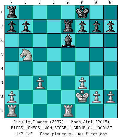 Last move : 1/2-1/2 2023 September 1 3:5:15 [Event "FICGS__CHESS__WCH_STAGE_1_GROUP_04__000027"] [Site "FICGS"] [Date "2023.07.04"] [Round "1"] [White "Cirulis,Ilmars"] [Black "Mach,Jiri"] [Result "1/2-1/2"] [WhiteElo "2237"] [BlackElo "2015"] 1.e4 c5 2.d4 cxd4 3.Nf3 e5 4.c3 Nc6 5.cxd4 exd4 6.Nxd4 Nf6 7.Nc3 Bb4 8.Bc4 O-O 9.O-O Bxc3 10.bxc3 Nxe4 11.Ba3 Re8 12.Nb5 d6 13.Qd5 Re6 14.Qd3 Nc5 15.Qd5 Ne5 16.Bxc5 Nxc4 17.Qxc4 dxc5 18.Qxc5 Qe7 19.Qxe7 Rxe7 20.f3 Be6 21.Rfe1 Kf8 22.Kf2 1/2-1/2 Follow this game move after move (download)Personally, I rather look forward to a computer program winning the world Chess Championship. Humanity needs a lesson in humility. (Richard Dawkings) Ich würde mich als ganz normalen Jungen bezeichnen [Im Alter von 12]. (Sergej Karjakin) Para mi, el Ajedrez es la vida y cada partida es como una nueva vida. Todo jugador de Ajedrez suele vivir muchas vidas durante su vida. (Eduard Gufeld) Même un GMI sait rarement calculer sur plus de cinq coups une attaque à sacrifices. (Rudolf Spielmann) Luck has a peculiar habit of favoring those who don't depend on it. (Author unknown)
