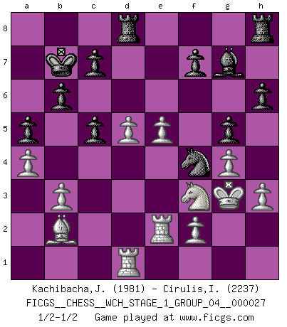 Last move : 1/2-1/2 2023 September 5 5:49:47 [Event "FICGS__CHESS__WCH_STAGE_1_GROUP_04__000027"] [Site "FICGS"] [Date "2023.07.04"] [Round "1"] [White "Kachibacha,Jobadi"] [Black "Cirulis,Ilmars"] [Result "1/2-1/2"] [WhiteElo "1981"] [BlackElo "2237"] 1.e4 e5 2.Nf3 Nc6 3.Bb5 Nf6 4.O-O Nxe4 5.d4 Nd6 6.Bxc6 dxc6 7.dxe5 Nf5 8.Qxd8+ Kxd8 9.Nc3 Bd7 10.h3 h6 11.b3 c5 12.Rd1 Kc8 13.Nd5 g5 14.c4 Be6 15.Bb2 a5 16.a4 Ne7 17.Rd2 b6 18.g4 Kb7 19.Rad1 Ng6 20.Kh2 Bxd5 21.cxd5 Rd8 22.Kg3 Bg7 23.Re2 Nf4 24.Red2 Ng6 25.Re2 Nf4 1/2-1/2 Follow this game move after move (download)When you play Bobby, it is not a question if you win or lose. It is a question if you survive. (Boris Spassky) Wenn Capablanka heute auf der Schachbühne erscheinen würde, hätte er ein halbes Jahr gebraucht um sich die Schachtheorie anzueignen. Und dann hätte er alles und jeden besiegt. (Mikhail Moiseyevich Botvinik) La vida es como un juego de Ajedrez, cambiando con cada movimiento. (Proverbio Chino) Psychologiquement, tu dois avoir confiance en toi même, mais cette confiance doit être basée sur des faits. (Robert Fischer) Do you know these so called Volunteers don't even get paid! (Simpsons)