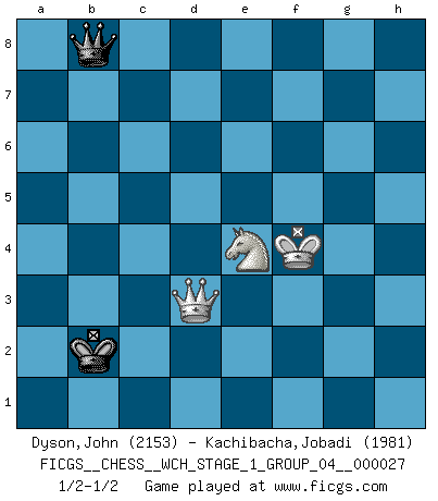 Last move : 1/2-1/2 2023 November 25 22:7:27 [Event "FICGS__CHESS__WCH_STAGE_1_GROUP_04__000027"] [Site "FICGS"] [Date "2023.07.04"] [Round "1"] [White "Dyson,John"] [Black "Kachibacha,Jobadi"] [Result "1/2-1/2"] [WhiteElo "2153"] [BlackElo "1981"] 1.e4 e6 2.d4 d5 3.Nc3 Bb4 4.e5 c5 5.a3 Bxc3+ 6.bxc3 Ne7 7.Qg4 Qc7 8.Qxg7 Rg8 9.Qxh7 cxd4 10.Ne2 Nbc6 11.f4 Bd7 12.Qh3 dxc3 13.Qxc3 Nf5 14.Rb1 d4 15.Qc5 b6 16.Qc4 O-O-O 17.g3 Na5 18.Qxc7+ Kxc7 19.Bg2 Bc6 20.Bxc6 Kxc6 21.Rg1 Kd5 22.g4 Ne3 23.Bxe3 dxe3 24.Nc3+ Kc6 25.Rd1 Nc4 26.Ke2 Nxa3 27.h4 b5 28.Rxd8 Rxd8 29.Ne4 Rd4 30.Kxe3 Nxc2+ 31.Kf3 b4 32.h5 b3 33.h6 Rd3+ 34.Kf2 Rh3 35.g5 a5 36.Nd6 a4 37.Nxf7 Nd4 38.g6 Nf5 39.g7 Ne7 40.f5 exf5 41.e6 Kd5 42.g8Q Nxg8 43.Rxg8 b2 44.Rb8 Rb3 45.Rxb3 axb3 46.e7 b1Q 47.e8Q Qc2+ 48.Kg3 Qc3+ 49.Kg2 Qc2+ 50.Kg3 Qd3+ 51.Kf4 Qe4+ 52.Qxe4+ fxe4 53.h7 b2 54.h8Q b1Q 55.Qd8+ Kc4 56.Nd6+ Kb3 57.Qb6+ Ka2 58.Qa5+ Kb3 59.Qb6+ Ka2 60.Qa6+ Kb2 61.Qb5+ Ka1 62.Qc6 Qf1+ 63.Ke5 Qd3 64.Qc1+ Qb1 65.Qa3+ Qa2 66.Qc1+ Qb1 67.Qa3+ Qa2 68.Qe3 Qa5+ 69.Kf4 Qb4 70.Nxe4 Kb2 71.Qd3 Qb8+ 1/2-1/2 Follow this game move after move (download)Combinations have always been the most intriguing aspect of Chess. The masters look for them, the public applauds them, the critics praise them. It is because combinations are possible that Chess is more than a lifeless mathematical exercise. They are the poetry of the game; they are to Chess what melody is to music. They represent the triumph of mind over matter. (Reuben Fine) Was ist der Unterschied zwischen einem Strassenarbeiter und einem Schachspieler? --Der Schachspieler bewegt sich ab und zu. (Anonymous) Uno no tiene que jugar muy bien, es suficiente jugar mejor que el oponente. (Siegbert Tarrasch) Je ne suis pas le dernier à jouer lâchement des coups douteux pendant le zeïtnot de l'adversaire pour l'achever: en effet les coups qui font le plus peur sont ceux que l'on ne comprend pas. Je me fais souvent peur quand je joue. (Un professeur anonyme) A shortcut is the longest distance between two points. (Don Groves)