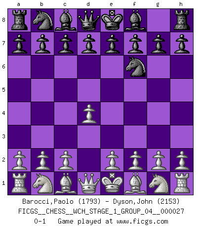 Last move : 0-1 2023 August 5 6:9:11 [Event "FICGS__CHESS__WCH_STAGE_1_GROUP_04__000027"] [Site "FICGS"] [Date "2023.07.04"] [Round "1"] [White "Barocci,Paolo"] [Black "Dyson,John"] [Result "0-1"] [WhiteElo "1793"] [BlackElo "2153"] 1.d4 Nf6 0-1 This chess game has been lost on time (started : 2023.07.04 15:4:28) Follow this game move after move (download)Though most people love to look at the games of the great attacking masters, some of the most successful players in history have been the quiet positional players. They slowly grind you down by taking away your space, tying up your pieces, and leaving you with virtually nothing to do ! (Yasser Seirawan) Kein Schachspieler kann gut schlafen. (H. G. Wells) Cuando tengo las piezas blancas, yo gano porque soy blanco; Cuando tengo las piezas negras, yo gano porque soy Bogolyubov. (Bogolyubov) Le succès, c'est être capable d'aller d'échec en échec sans perdre son enthousiasme. (Winston Churchill) Good decisions come from experience, and experience comes from bad decisions. (Anonymous)