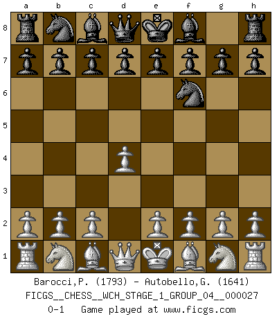 Last move : 0-1 2023 August 5 20:6:21 [Event "FICGS__CHESS__WCH_STAGE_1_GROUP_04__000027"] [Site "FICGS"] [Date "2023.07.04"] [Round "1"] [White "Barocci,Paolo"] [Black "Autobello,Giovanni"] [Result "0-1"] [WhiteElo "1793"] [BlackElo "1641"] 1.d4 Nf6 0-1 This chess game has been lost on time (started : 2023.07.04 15:4:28) Follow this game move after move (download)There is no remorse like the remorse of Chess. (H. G. Wells) Der Verteidiger gebe der Gewalt nach, aber nur der Gewalt. Er schaffe sich nicht freiwillig, etwa aus Blindheit oder aus Schrecken, irgendwelche Schwächen. Er lasse sich nicht bluffen. (Emanuel Lasker) Bobby Fischer es el jugador de Ajedrez mas grande que jamás haya existido. (Ken Smith) Le pion, dans sa simplicité, marche droit devant lui, mais lorsqu'il prend, il le fait obliquement? Ainsi l'homme, tant qu'il reste pauvre, marche dans la droiture et vit honnêtement, mais lorsqu'il recherche les honneurs, il flatte, se parjure et, par les voies obliques, cherche une position supérieure sur l'échiquier du monde. (Jean de Galles) I'm extremely disappointed. I send you out for exciting, new designer drugs, you come back with tomato sauce. (Gregory House, House M.D.)
