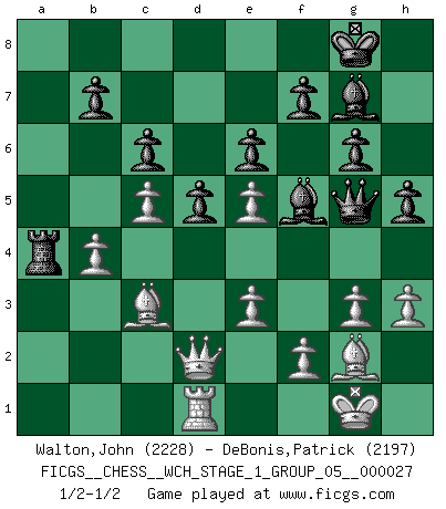 Last move : 1/2-1/2 2023 September 12 9:6:4 [Event "FICGS__CHESS__WCH_STAGE_1_GROUP_05__000027"] [Site "FICGS"] [Date "2023.07.04"] [Round "1"] [White "Walton,John"] [Black "DeBonis,Patrick"] [Result "1/2-1/2"] [WhiteElo "2228"] [BlackElo "2197"] 1.d4 Nf6 2.c4 g6 3.g3 c6 4.Nf3 Bg7 5.Bg2 d5 6.O-O O-O 7.b3 Bf5 8.Bb2 Nbd7 9.Nbd2 e6 10.h3 h5 11.Rc1 Qa5 12.a3 Ne4 13.e3 Rfc8 14.b4 Qd8 15.Ne5 Nxd2 16.Qxd2 Nxe5 17.dxe5 a5 18.Rfd1 axb4 19.axb4 Qg5 20.Bc3 Ra4 21.Ra1 Rca8 22.Rxa4 Rxa4 23.c5 1/2-1/2 Follow this game move after move (download)No one ever won a game by resigning. (Unknown) Ich verachte Kasparow. (Viktor Kortschnoi) Un Peón pasado es un criminal, quién debe ser mantenido bajo candado y llave. Leves medidas, tales como vigilancia policiaca, no son suficientes. (Aaron Nimzovich) Donnez-moi un Cavalier en 6e et je gagnerais toutes mes parties. (Steinitz) The faster the computer, the slower the brain. (Thibault de Vassal)