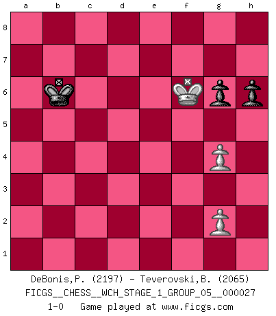 Last move : 1-0 2023 October 4 13:50:14 [Event "FICGS__CHESS__WCH_STAGE_1_GROUP_05__000027"] [Site "FICGS"] [Date "2023.07.04"] [Round "1"] [White "DeBonis,Patrick"] [Black "Teverovski,Bogoljub"] [Result "1-0"] [WhiteElo "2197"] [BlackElo "2065"] 1.d4 Nf6 2.c4 e5 3.dxe5 Ng4 4.e3 Nxe5 5.f4 Nec6 6.Nc3 d6 7.b3 Be7 8.Bb2 Nd7 9.Nge2 a5 10.Ng3 O-O 11.Be2 Re8 12.Qd2 Bh4 13.Bf3 Nc5 14.O-O Bxg3 15.hxg3 Nb4 16.e4 Nbd3 17.Ba3 Bd7 18.Rad1 Bc6 19.Qe3 Nb4 20.Bb2 a4 21.Nd5 Bxd5 22.cxd5 f6 23.e5 a3 24.Bc3 Nxa2 25.Bd4 Nb4 26.Bxc5 dxc5 27.Qxc5 Na6 28.Qxa3 fxe5 29.d6 cxd6 30.Rxd6 Qb8 31.fxe5 Rxe5 32.Rfd1 Nc5 33.Qb4 Ne6 34.Qxb7 Qxb7 35.Bxb7 Rb8 36.Rxe6 Rxe6 37.Bd5 Kf7 38.Re1 R8b6 39.Rxe6 Rxe6 40.Kf2 Kf6 41.Bxe6 Kxe6 42.Ke3 Ke5 43.g4 h6 44.b4 g6 45.b5 Kd6 46.Kf4 Kd5 47.b6 Kc6 48.Ke5 Kxb6 49.Kf6 1-0 Follow this game move after move (download)Chess is war over the board. The object is to crush the opponents mind. (Bobby Fischer) Ein Remis kann durch Wiederholung von drei Zügen oder durch einen schlechte Zug erreicht werden. (Savielly Grigorievitsch Tartakower) Aquel que toma al Peón de Caballo de la Reina, se pasará la noche a dormir en la calle. (Anónimo) En blitz, le Cavalier l'emporte sur le Fou. (Vlastimil Hort) To steal ideas from one person is plagiarism. To steal from many is research. (Unknown)