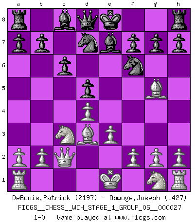 Last move : 1-0 2023 September 5 5:1:45 [Event "FICGS__CHESS__WCH_STAGE_1_GROUP_05__000027"] [Site "FICGS"] [Date "2023.07.04"] [Round "1"] [White "DeBonis,Patrick"] [Black "Obwoge,Joseph"] [Result "1-0"] [WhiteElo "2197"] [BlackElo "1427"] 1.d4 d5 2.c4 e6 3.Nc3 Nf6 4.cxd5 exd5 5.Bg5 Be7 6.e3 c6 7.Bd3 Nbd7 8.Qc2 1-0 This chess game has been lost on time (started : 2023.07.04 15:4:30) Follow this game move after move (download)Fischer is under obligation to nobody. (Joseph Platz) Ein unbeabsichtigtes Patt ist der Gipfel der Dummheit. (Anonymous) Una buena ofensiva y una buena defensa, comienzan ambas con un buen desarrollo. (Bruce A. Moon) Mon pion favori sur ma case favorite ! Bronstein en parlant d'un coup de pion en h5 quand il avait les Noirs. A journey of a thousand sites begins with a single click. (Author unknown)