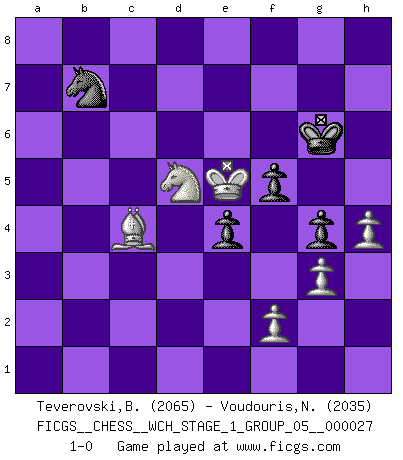 Last move : 1-0 2023 November 11 11:10:48 [Event "FICGS__CHESS__WCH_STAGE_1_GROUP_05__000027"] [Site "FICGS"] [Date "2023.07.04"] [Round "1"] [White "Teverovski,Bogoljub"] [Black "Voudouris,Nick"] [Result "1-0"] [WhiteElo "2065"] [BlackElo "2035"] 1.e4 Nf6 2.e5 Nd5 3.d4 d6 4.Nf3 dxe5 5.Nxe5 c6 6.Be2 Bf5 7.O-O Nd7 8.Nf3 e6 9.c4 N5f6 10.Nh4 Bxb1 11.Rxb1 Bd6 12.g3 O-O 13.Qc2 a5 14.Rd1 Re8 15.Bf3 h6 16.Bg2 Qc7 17.a3 Rac8 18.Bd2 b5 19.cxb5 cxb5 20.Qxc7 Bxc7 21.Bc6 Rb8 22.b4 axb4 23.Bxb4 Rec8 24.Nf3 Bd8 25.Rbc1 Nb6 26.Bxb5 Nbd5 27.Bd3 g5 28.Bc5 Ra8 29.Ne5 Be7 30.Bxe7 Nxe7 31.Rxc8+ Nxc8 32.Ra1 Ra4 33.Nf3 g4 34.Bc2 Rc4 35.Ne1 Rxd4 36.a4 Nd5 37.Bd3 Kf8 38.a5 Ke7 39.a6 Na7 40.h3 Nb4 41.Bf1 h5 42.Ra4 f5 43.h4 Kf7 44.Nd3 Nbc6 45.Rxd4 Nxd4 46.Nf4 Nf3+ 47.Kg2 e5 48.Bc4+ Kg7 49.Nd5 Kg6 50.Nc3 Nd4 51.Kf1 Kf6 52.Ke1 Ke7 53.Nd5+ Kd6 54.Nf6 Kc5 55.Bd3 Kd6 56.Nxh5 Ke7 57.Kd2 Nb3+ 58.Kc3 Nc5 59.Ng7 Kf6 60.Ne8+ Ke7 61.Nc7 Kf6 62.Kc4 Nxa6 63.Nxa6 e4 64.Be2 Nc6 65.Nb4 Nd8 66.Kd5 Ne6 67.Bc4 Nd8 68.Kd4 Nb7 69.Nd5+ Kg6 70.Ke5 1-0 Follow this game move after move (download)Chess is a part of culture and if a culture is declining then Chess too will decline. (Mikhail Botvinnik) Das Schachspiel hat wie die Liebe, die Musik, die Fähigkeit, den Menschen glücklich zu machen. Ich habe ein leises Gefühl des Bedauerns für jeden, der das Schachspiel nicht kennt, so wie ich jeden bedaure, der die Liebe nicht kennt. (Siegbert Tarrasch) Si un gobernante no entiende al Ajedrez, ¿como puede governar él un reinado?. (El Rey Khusros II) J'apprécie les joueurs d'est-indienne, c'est grâce à eux que je nourris ma famille depuis tant d'années. (Petrosian) He who defends everything defends nothing. (Frederick the Great)