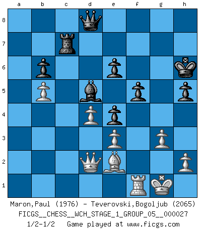 Last move : 1/2-1/2 2023 August 10 14:44:33 [Event "FICGS__CHESS__WCH_STAGE_1_GROUP_05__000027"] [Site "FICGS"] [Date "2023.07.04"] [Round "1"] [White "Maron,Paul"] [Black "Teverovski,Bogoljub"] [Result "1/2-1/2"] [WhiteElo "1976"] [BlackElo "2065"] 1.d4 Nf6 2.Nf3 e6 3.e3 b6 4.Bd3 Bb7 5.O-O d5 6.Ne5 Bd6 7.f4 c5 8.c3 O-O 9.Nd2 Ne4 10.Nxe4 dxe4 11.Be2 Nc6 12.Bd2 Rc8 13.a4 Be7 14.b4 cxb4 15.Nxc6 Bxc6 16.cxb4 Qd7 17.b5 Bd5 18.Qb1 h6 19.a5 f5 20.Qb2 g5 21.g3 Kh7 22.Bb4 Bxb4 23.Qxb4 Rg8 24.axb6 axb6 25.Qb2 gxf4 26.Rxf4 Qc7 27.Qb4 Rg7 28.Ra3 Kg6 29.Rf1 h5 30.Qe1 Qd8 31.Rc3 Rgc7 32.Rxc7 Rxc7 33.Qd1 Qh8 34.Qd2 Qc8 35.Qd1 Kg5 36.Qb1 Kh6 37.Qb4 Qd8 38.Qd2 Ra7 39.Qc1 Rc7 40.Qd2 Ra7 41.Qc1 Rc7 42.Qb2 Ra7 43.Qc3 Rc7 44.Qd2 1/2-1/2 Follow this game move after move (download)What is the difference between chess and football? Everybody understands football, but nobody plays it. Everybody plays chess, but nobody understands it. Everything is relative. (Vladimir Kramnik) Wenn Capablanka heute auf der Schachbühne erscheinen würde, hätte er ein halbes Jahr gebraucht um sich die Schachtheorie anzueignen. Und dann hätte er alles und jeden besiegt. (Mikhail Moiseyevich Botvinik) El Ajedrez es parte de la cultura, y si una cultura esta en decadencia, entonces también el Ajedrez declinará. (Mikhail Botvinnik) Aidez vos pièces, elles vous aideront. (Paul Morphy) There are two kinds of people in the world, my friend. Those who have a loaded gun and those who dig. You dig ! (Blondie in The Good, The Bad and The Ugly)
