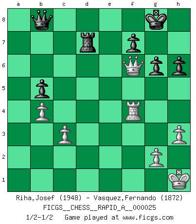 Last move : 1/2-1/2 2007 November 11 21:49:8 [Event "FICGS__CHESS__RAPID_A__000025"] [Site "FICGS"] [Date "2007.09.02"] [Round "1"] [White "Riha,Josef"] [Black "Vasquez,Fernando"] [Result "1/2-1/2"] [WhiteElo "1948"] [BlackElo "1872"] 1.e4 e5 2.Nf3 d6 3.d4 exd4 4.Nxd4 Nf6 5.Nc3 Be7 6.Be2 O-O 7.O-O c5 8.Nf3 Nc6 9.Bf4 Be6 10.Re1 d5 11.exd5 Nxd5 12.Nxd5 Bxd5 13.c3 Re8 14.Bd3 g6 15.Bc2 Be6 16.Nd2 Qb6 17.b3 Bf6 18.Ne4 Bg7 19.Bg5 Bf5 20.Rc1 Re6 21.Qd2 Ne5 22.f3 Rae8 23.Rcd1 Nc6 24.Bd3 Ne5 25.Bb1 c4 26.Be3 Qa5 27.b4 Qa3 28.Bf2 Nd3 29.Bxd3 cxd3 30.Qxd3 Qxa2 31.Bd4 Rd8 32.Qe3 Bxe4 33.fxe4 Qa4 34.Ra1 Bxd4 35.Qxd4 Qe8 36.Qxa7 Rxe4 37.Rxe4 Qxe4 38.Qf2 Rd3 39.Qf6 b5 40.Rf1 Qe3+ 41.Kh1 Qe8 42.h3 h6 43.Kg1 Rd2 44.Rf4 Rd7 45.Kh2 Qb8 46.Kh1 1/2-1/2 Philidor : Exchange variation Kingside Castling by player Black (move 6) Kingside Castling by player White (move 7) This chess game ended in a draw. Follow this game move after move (download)If you aren't afraid of Spassky, then I have removed the element of money. (Jim Slater) Wenn sie aufgeben, dann danke ich Ihnen für das Spiel (Eventualzug beim Fernschach). (Anonymous) La pasion por jugar al Ajedrez es una de las mas inexplicables en el mundo. (H.G. Wells) Les échecs sont plus proches de l'art de l'assassinat que de l'art de la guerre. (Arturo Perez-Reverte) The meaning of life is that it is to be lived, and it is not to be traded and conceptualized and squeezed into a pattern of systems. (Bruce Lee)
