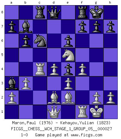Last move : 1-0 2023 September 30 17:8:4 [Event "FICGS__CHESS__WCH_STAGE_1_GROUP_05__000027"] [Site "FICGS"] [Date "2023.07.04"] [Round "1"] [White "Maron,Paul"] [Black "Kehayov,Yulian"] [Result "1-0"] [WhiteElo "1976"] [BlackElo "1823"] 1.d4 Nf6 2.Nf3 d5 3.e3 e6 4.Bd3 c5 5.c3 b6 6.O-O Be7 7.Nbd2 Bb7 8.Ne5 O-O 9.f4 Ne4 10.Nxe4 dxe4 11.Bc4 Nc6 12.b3 cxd4 13.cxd4 Na5 14.Be2 Nc6 15.Bd2 Rc8 16.Rc1 Ba3 17.Rc4 1-0 This chess game has been lost on time (started : 2023.07.04 15:4:30) Follow this game move after move (download)The mistakes are there, waiting to be made. (Savielly Tartakower) Wenn du nicht weißt was du tun sollst, warte bis dein Gegner eine Idee hat. Sie wird sicher schlecht sein. (Siegbert Tarrasch) El Ajedrez es en su esencia, un juego. En su forma, un arte. Y en su ejecución, una ciencia. (Baron Tassilo) Toutes les manuvres exécutées sur une colonne ouverte ont pour but ultime l'intrusion définitive sur la septième ou la huitième rangée, en plein cur de la position ennemie. (Aaron Nimzovitch) At last I discovered the true beauty of chess. So I proposed to her. (Dinesh De Silva)