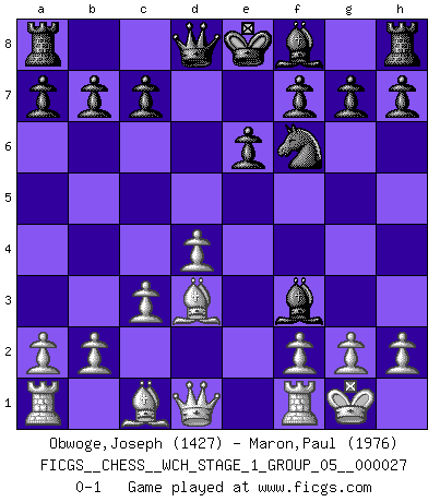Last move : 0-1 2023 September 20 0:22:0 [Event "FICGS__CHESS__WCH_STAGE_1_GROUP_05__000027"] [Site "FICGS"] [Date "2023.07.04"] [Round "1"] [White "Obwoge,Joseph"] [Black "Maron,Paul"] [Result "0-1"] [WhiteElo "1427"] [BlackElo "1976"] 1.e4 e6 2.d4 d5 3.Nd2 dxe4 4.Nxe4 Bd7 5.Nf3 Bc6 6.Bd3 Nd7 7.c3 Ngf6 8.Nxf6 Nxf6 9.O-O Bxf3 0-1 This chess game has been lost on time (started : 2023.07.04 15:4:30) Follow this game move after move (download)We cannot resist the fascination of sacrifice, since a passion for sacrifices is part of a Chessplayer's nature. (Rudolf Spielman) Schach ist das Spiel, das die Verrückten gesund hält. (Albert Einstein) Si pudieramos observar el interior de la cabeza de un jugador de Ajedrez, encontraríamos ahí un mundo lleno de sentimientos, imágenes, ideas, emoción y pasión. (Alfred Binet) Il n'y a pas de prix trop élevé au scalp de l'ennemi. (Koblentz) Art disturbs, science reassures. (Georges Braque, Le Jour et la Nuit)