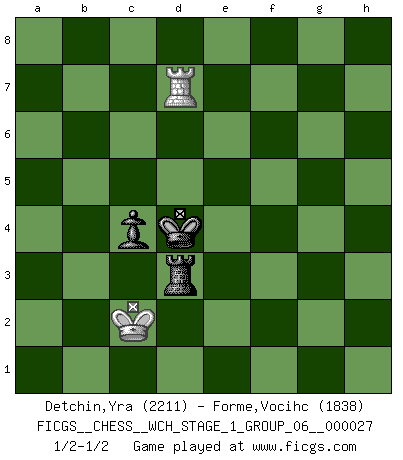 Last move : 1/2-1/2 2023 November 30 12:36:24 [Event "FICGS__CHESS__WCH_STAGE_1_GROUP_06__000027"] [Site "FICGS"] [Date "2023.07.04"] [Round "1"] [White "Detchin,Yra"] [Black "Forme,Vocihc"] [Result "1/2-1/2"] [WhiteElo "2211"] [BlackElo "1838"] 1.d4 Nf6 2.c4 c6 3.Nc3 d5 4.Nf3 e6 5.Bg5 h6 6.Bh4 dxc4 7.e4 g5 8.Bg3 b5 9.Ne5 Nbd7 10.Be2 Bb7 11.Nxd7 Qxd7 12.Be5 Bg7 13.h4 O-O-O 14.Qc1 Rhg8 15.hxg5 hxg5 16.Qxg5 Ne8 17.Qe3 Bxe5 18.dxe5 Qc7 19.f4 f6 20.Rd1 fxe5 21.f5 Rxd1+ 22.Nxd1 Qg7 23.Bf3 exf5 24.exf5 Nf6 25.Nc3 Rd8 26.O-O Qe7 27.Qxa7 e4 28.Re1 Qb4 29.a3 Qxb2 30.Nxe4 Nxe4 31.Bxe4 Qd2 32.Qe3 Qxe3+ 33.Rxe3 c5 34.Kf2 Bxe4 35.Rxe4 c3 36.Re5 c4 37.Re2 Kc7 38.g4 Rd4 39.Ke3 Rd3+ 40.Kf2 Rd4 41.Rc2 Rxg4 42.Rxc3 Rf4+ 43.Ke2 Rxf5 44.a4 Kb6 45.axb5 Kxb5 46.Kd2 Rd5+ 47.Kc2 Kb4 48.Re3 Rc5 49.Re6 Rb5 50.Re8 Rd5 51.Rb8+ Rb5 52.Rg8 Ra5 53.Rb8+ Rb5 54.Rg8 Rd5 55.Rg7 Rd3 56.Rb7+ Kc5 57.Rc7+ Kd4 58.Rd7+ Ke4 59.Rc7 Kd4 60.Rd7+ Ke3 61.Re7+ Kd4 62.Rd7+ 1/2-1/2 Follow this game move after move (download)After black's reply to 1.e4 with 1..e5, leaves him always trying to get into the game. (Howard Staunton) Vom Schach wurde gesagt das Leben sei dafür nicht lange genug. Aber das ist der Fehler des Lebens, nicht des Schach'. (Irving Chernev) Aquellos que dicen entender al Ajedrez, no entienden nada. (Robert Hubner) J'ai vu le vaincu d'Echecs jouer des années durant dans l'espoir de la fête de la victoire. Car tu es plus riche de ce qu'elle existe si même elle n'est point pour toi. Ainsi de la perle du fond des mers. (Antoine de Saint-Exupéry) If only faces could talk... (Pat Summerall, Sportscaster during the Super Bowl)