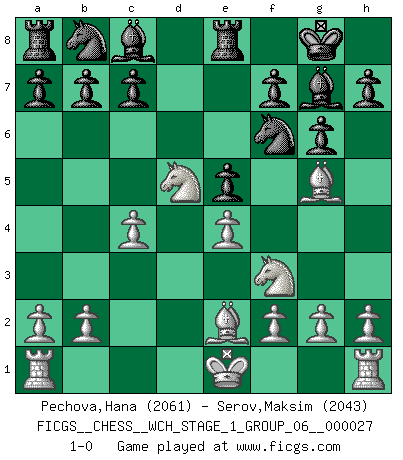 Last move : 1-0 2023 September 20 13:18:30 [Event "FICGS__CHESS__WCH_STAGE_1_GROUP_06__000027"] [Site "FICGS"] [Date "2023.07.04"] [Round "1"] [White "Pechova,Hana"] [Black "Serov,Maksim"] [Result "1-0"] [WhiteElo "2061"] [BlackElo "2043"] 1.d4 Nf6 2.c4 g6 3.Nc3 Bg7 4.e4 d6 5.Nf3 O-O 6.Be2 e5 7.dxe5 dxe5 8.Qxd8 Rxd8 9.Bg5 Re8 10.Nd5 1-0 This chess game has been lost on time (started : 2023.07.04 15:4:32) Follow this game move after move (download)The essence of Chess is thinking about what Chess is. (David Bronstein) Ich habe Kasparov in Rente geschickt. (Veselin Topalov) El Jaque al descubierto es el bombardero del tablero. (Reuben Fine) Une platitude souvent récitée à propos des Echecs est qu'une des choses les plus difficiles à réaliser est de gagner une position gagnante. Cela ne manque pas de sens mais, pour ma part, j'ai toujours trouvé plus difficile de gagner une position perdante. (Tim Krabbe) Go and wake up your luck. (Persian saying)