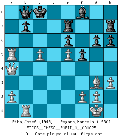 Last move : 1-0 2007 September 11 18:15:12 [Event "FICGS__CHESS__RAPID_A__000025"] [Site "FICGS"] [Date "2007.09.02"] [Round "1"] [White "Riha,Josef"] [Black "Pagano,Marcelo"] [Result "1-0"] [WhiteElo "1948"] [BlackElo "1930"] 1.e4 c6 2.d4 g6 3.Nc3 Bg7 4.Nf3 d5 5.h3 dxe4 6.Nxe4 Nf6 7.Bd3 Nxe4 8.Bxe4 Bf5 9.Bxf5 Qa5+ 10.c3 Qxf5 11.O-O Nd7 12.Re1 e6 13.Qb3 O-O-O 14.Bg5 Rde8 15.Bh4 Qd5 16.Bg3 h6 17.Qb4 Nb6 18.Ne5 Bf8 19.Qb3 Rh7 20.c4 Qd8 21.c5 Nd7 22.Qa4 Nxe5 23.Qxa7 f6 24.b4 Bg7 25.dxe5 f5 26.b5 Qc7 27.Rab1 cxb5 28.Rxb5 Bf8 29.Reb1 Qb8 30.Qa4 R8e7 31.Ra5 1-0 Caro-Kann defense Kingside Castling by player White (move 11) Queenside Castling by player Black (move 13) Player White won this chess game. Follow this game move after move (download)When your house is on fire, you can't be bothered with the neighbors. Or, as we say in Chess, if your King is under attack you don't worry about losing a Pawn on the Queen's side. (Gary Kasparov) Kritik überlasse ich den Spießern. Ich zeige nichts, wofür ich mich schämen muss. (Alexandra Kosteniuk) El pensamiento metódico es mas útil en el Ajedrez que la inspiración. (C. J. S. Purdy) En blitz, le Cavalier l'emporte sur le Fou. (Vlastimil Hort) The production of too many useful things results in too many useless people. (Karl Marx)