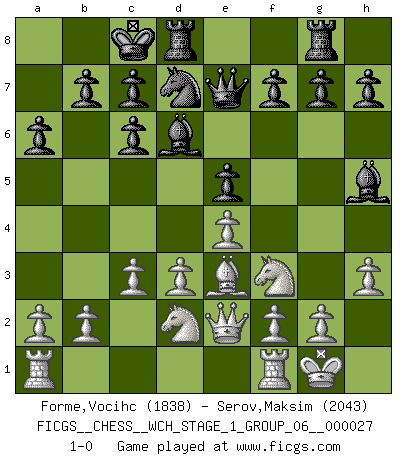 Last move : 1-0 2023 September 15 16:45:22 [Event "FICGS__CHESS__WCH_STAGE_1_GROUP_06__000027"] [Site "FICGS"] [Date "2023.07.04"] [Round "1"] [White "Forme,Vocihc"] [Black "Serov,Maksim"] [Result "1-0"] [WhiteElo "1838"] [BlackElo "2043"] 1.e4 e5 2.Nf3 Nc6 3.Bb5 a6 4.Ba4 Nf6 5.d3 Bc5 6.Bxc6 dxc6 7.O-O Bd6 8.Nc3 Bg4 9.h3 Bh5 10.Qe2 Nd7 11.Be3 Qe7 12.Nb1 O-O-O 13.Nbd2 Rhg8 14.c3 1-0 This chess game has been lost on time (started : 2023.07.04 15:4:32) Follow this game move after move (download)If one piece is badly posted, the whole game is bad. (Tarrasch) Je mehr wir mit Computern analysieren, desto mehr glauben wir an Verteidigung. (Vladimir Kramnik) Un entendimiento minucioso de las típicas continuaciones de mate hacen de las mas complicadas combinaciones de sacrificio que conducen hacia ellas no solo no dificiles, sino casi un asunto de rutina. (Siegbert Tarrasch) Les Echecs sont et restent toujours un combat, un combat intégral comme la boxe, la lutte ou un autre sport, et où il doit y avoir un vainqueur et un vaincu. (Joseph Emil Diemer) History is the quarrels of popes and kings, with wars or pestilences in every page; the men all so good for nothing, and hardly any women at all. (Jane Austen)