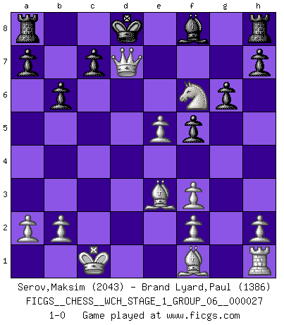 Last move : 1-0 2023 August 21 22:35:11 [Event "FICGS__CHESS__WCH_STAGE_1_GROUP_06__000027"] [Site "FICGS"] [Date "2023.07.04"] [Round "1"] [White "Serov,Maksim"] [Black "Brand Lyard,Paul"] [Result "1-0"] [WhiteElo "2043"] [BlackElo "1386"] 1.d4 d5 2.c4 Nf6 3.cxd5 Qxd5 4.Nc3 Qd8 5.Nf3 Bg4 6.Qb3 b6 7.e4 Bxf3 8.gxf3 Qxd4 9.Be3 Qd8 10.e5 Nd5 11.Nxd5 e6 12.Nc3 g6 13.Ne4 f5 14.Qxe6+ Qe7 15.Nf6+ Kd8 16.O-O-O Nd7 17.Rxd7+ Qxd7 18.Qxd7+ 1-0 Follow this game move after move (download)Chess, like love, like music, has the power to make people happy. (Siegbert Tarrasch) Computer sind die einzigen Gegner, die nicht immer eine Ausrede auf Lager haben, wenn sie gegen mich verlieren. (Robert James Fischer) El Ajedrez lo es todo: arte, ciencia y deporte. (Anatoly Karpov) Les échecs, c'est la lutte contre l'erreur. (Johannes Zukertort) Wisdom doesn't necessarily come with age. Sometimes age just shows up all by itself. (Tom Watson)
