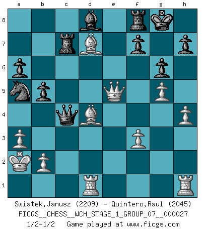 Last move : 1/2-1/2 2023 October 5 8:18:15 [Event "FICGS__CHESS__WCH_STAGE_1_GROUP_07__000027"] [Site "FICGS"] [Date "2023.07.04"] [Round "1"] [White "Swiatek,Janusz"] [Black "Quintero,Raul"] [Result "1/2-1/2"] [WhiteElo "2209"] [BlackElo "2045"] 1.e4 c5 2.Nf3 d6 3.d4 cxd4 4.Nxd4 Nf6 5.Nc3 a6 6.Be3 e5 7.Nb3 Be7 8.f3 Be6 9.Qd2 O-O 10.O-O-O Nbd7 11.g4 b5 12.g5 Nh5 13.Kb1 Nb6 14.Na5 Rc8 15.a3 g6 16.Rg1 Qc7 17.Nd5 Nxd5 18.exd5 Bd7 19.h4 Bd8 20.Nc6 Bxc6 21.dxc6 Qxc6 22.Bh3 Rc7 23.Qxd6 Qxc2+ 24.Ka1 Nf4 25.Bd7 Ne2 26.Rh1 Nd4 27.Qxe5 Nb3+ 28.Ka2 Na5 29.Bd4 Qc4+ 30.Kb1 Qc2+ 31.Ka2 Qc4+ 32.Kb1 Qc2+ 33.Ka2 Qc4+ 1/2-1/2 Follow this game move after move (download)The hallmark of the artist is simplicity. (Larry Evans) Bis zum Jahr 1971 verlief in meiner Schachkariere alles glatt. Dieses dramatische Match [Fischer-Taimanov 6:0] machte mein Leben zur Hölle. (Mark Taimanov) Observen a Garry Kasparov. Después de una derrota, invariablemente el gana la próxima partida. Prácticamente hace pedazos a su siguiente oponente. Eso es algo que tenemos que aprender a lograr. (Maurice Ashley) Je menace de comprendre la position. (Anonyme) When you stop learning you start dying. (Scott Adams)