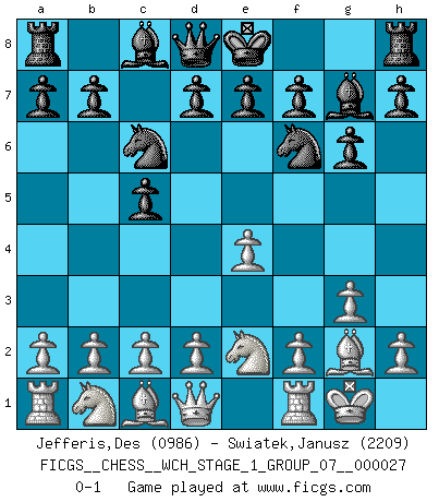 Last move : 0-1 2023 August 28 14:28:54 [Event "FICGS__CHESS__WCH_STAGE_1_GROUP_07__000027"] [Site "FICGS"] [Date "2023.07.04"] [Round "1"] [White "Jefferis,Des"] [Black "Swiatek,Janusz"] [Result "0-1"] [WhiteElo "0986"] [BlackElo "2209"] 1.e4 c5 2.g3 g6 3.Bg2 Nc6 4.Ne2 Bg7 5.O-O Nf6 0-1 This chess game has been lost on time (started : 2023.07.04 15:4:33) Follow this game move after move (download)Combinations have always been the most intriguing aspect of Chess. The masters look for them, the public applauds them, the critics praise them. It is because combinations are possible that Chess is more than a lifeless mathematical exercise. They are the poetry of the game; they are to Chess what melody is to music. They represent the triumph of mind over matter. (Reuben Fine) Was ist der Unterschied zwischen einem Strassenarbeiter und einem Schachspieler? --Der Schachspieler bewegt sich ab und zu. (Anonymous) Tu no necesitas jugar muy bien, únicamente ayudar a tu oponenet a que juegue muy mal. (Genrikh Chepukaitis) Soyez une menace à chaque fois que vous vous asseyez pour jouer. (Ken Smith) Memory is a crazy woman that hoards colored rags and throws away food. (Austin O'Malley)