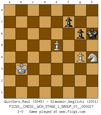 Last move : 1-0 2023 December 3 19:59:47 [Event "FICGS__CHESS__WCH_STAGE_1_GROUP_07__000027"] [Site "FICGS"] [Date "2023.07.04"] [Round "1"] [White "Quintero,Raul"] [Black "Slawomir,Weglicki"] [Result "1-0"] [WhiteElo "2045"] [BlackElo "2201"] 1.Nf3 c5 2.b3 Nc6 3.Bb2 d6 4.d4 cxd4 5.Nxd4 Nf6 6.g3 Bd7 7.Bg2 e5 8.Nxc6 Bxc6 9.O-O h5 10.h3 Qc7 11.c4 Bxg2 12.Kxg2 Qc6+ 13.f3 d5 14.Bxe5 Rd8 15.Nc3 dxc4 16.Qc2 Be7 17.bxc4 O-O 18.Rad1 Qxc4 19.Qb3 Qc6 20.h4 Rfe8 21.e4 Rxd1 22.Rxd1 Rd8 23.Rxd8+ Bxd8 24.Bd4 a6 25.Ne2 b5 26.Qc3 Qxc3 27.Bxc3 Nd7 28.Kf2 g6 29.Ke3 Bb6+ 30.Bd4 Bc7 31.g4 hxg4 32.fxg4 Ne5 33.Bxe5 Bxe5 34.Nd4 Kg7 35.Kd3 Bf6 36.Nf3 Be7 37.e5 Kh6 38.Kd4 a5 39.Kd5 a4 40.Kd4 Kg7 41.Kd3 Kh6 42.Kc3 b4+ 43.Kc4 b3 44.axb3 axb3 45.Kxb3 Bxh4 46.Nxh4 1-0 This chess game has been lost on time (started : 2023.07.04 15:4:33) Follow this game move after move (download)In complicated positions, Bobby Fischer hardly had to be afraid of anybody. (Paul Keres) Wenn du auf das Glück wartest, wird das Leben ziemlich langweilig. (Mikhail Nekhemyevich Tal) Mi estilo es algo parecido entre un poco de Tal y Petrosian. (Reshevsky) Le plus grand jeu de l'esprit jamais inventé, plus vous l'apprenez, plus vous y prenez du plaisir. (Garry Kasparov) You can only get smarter by playing a smarter opponent. (Revolver, movie)