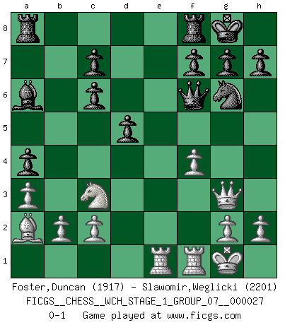 Last move : 0-1 2023 July 28 0:52:26 [Event "FICGS__CHESS__WCH_STAGE_1_GROUP_07__000027"] [Site "FICGS"] [Date "2023.07.04"] [Round "1"] [White "Foster,Duncan"] [Black "Slawomir,Weglicki"] [Result "0-1"] [WhiteElo "1917"] [BlackElo "2201"] 1.e4 e5 2.Nf3 Nc6 3.d4 exd4 4.Nxd4 Nf6 5.Nxc6 bxc6 6.e5 Nd5 7.Bc4 Nb6 8.Bb3 a5 9.a3 a4 10.Ba2 d5 11.O-O Bc5 12.Qf3 O-O 13.Qc3 Nd7 14.Qg3 Bd4 15.Nc3 Bxe5 16.Bf4 Qf6 17.Bxe5 Nxe5 18.Rae1 Ng6 19.f4 Ba6 0-1 Follow this game move after move (download)The game of chess is the touchstone of the intellect. (Goethe) Meine Liebe ist Schach, Schach, Schach. Ich muss jeden Tag Schach spielen, deshalb fühle ich mich so stark. (Miguel Najdorf) Yo creo que el Ajedrez posee una magia que es también una ayuda en la edad avanzada. Una rodilla reumática es olvidada durante una partida de Ajedrez y otros eventos pueden parecer algo sin importancia comparada a una catástrofe en el tablero de Ajedrez. (Vlastimil Hort) L'attaque fait le spectacle, la défense gagne les matchs. (Dicton footballistique) There is a very easy way to return from a casino with a small fortune : go there with a large one. (Jack Yelton)
