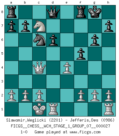 Last move : 1-0 2023 August 25 13:27:15 [Event "FICGS__CHESS__WCH_STAGE_1_GROUP_07__000027"] [Site "FICGS"] [Date "2023.07.04"] [Round "1"] [White "Slawomir,Weglicki"] [Black "Jefferis,Des"] [Result "1-0"] [WhiteElo "2201"] [BlackElo "0986"] 1.e4 e5 2.Nf3 d6 3.d4 exd4 4.Nxd4 g6 5.Nc3 Bg7 6.Be3 Ne7 7.Qd2 Bd7 8.Be2 Nbc6 9.O-O-O f5 10.Nxc6 Nxc6 11.Bg5 Bf6 12.Bxf6 Qxf6 13.Nd5 Qd8 14.Qc3 O-O 15.Bc4 Be6 16.Nxc7 Bxc4 17.Qxc4+ 1-0 This chess game has been lost on time (started : 2023.07.04 15:4:33) Follow this game move after move (download)Chess is imagination. (David Bronstein) Fischer: 'Remis!?' Uhlmann: 'Aber es muss doch dreimal Zugwiederholung sein!' Fischer: 'Sie nehmen das Remis an, wie ich es sage, sonst spiele ich weiter und werde Sie dann schlagen!' (Robert James Fischer) Personalmente, yo prefiero mirar hacia el futuro en donde un programa de computadora gane el título mundial de Ajedrez. La humanidad necesita una lección de humildad. (Richard Dawkings) Avant la finale, les dieux ont créé le milieu de partie. (Tarrasch) Patience, use the Force, think ! (Obi-Wan Kenobi in Star Wars ep.2)