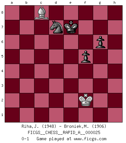 Last move : 0-1 2007 September 9 11:40:21 [Event "FICGS__CHESS__RAPID_A__000025"] [Site "FICGS"] [Date "2007.09.02"] [Round "1"] [White "Riha,Josef"] [Black "Broniek,Mariusz Maciej"] [Result "0-1"] [WhiteElo "1948"] [BlackElo "1906"] 1.d4 Nf6 2.Nf3 e6 3.c4 b6 4.a3 Bb7 5.Nc3 d5 6.cxd5 Nxd5 7.Qc2 Nxc3 8.bxc3 Be7 9.e3 Nd7 10.Be2 c5 11.O-O O-O 12.Rd1 Qc7 13.c4 cxd4 14.exd4 Rac8 15.a4 Bxf3 16.Bxf3 Qxc4 17.Qxc4 Rxc4 18.a5 b5 19.d5 Ne5 20.Be2 Rc2 21.Bxb5 Bc5 22.d6 Ng4 23.Rd2 Rxd2 24.Bxd2 Nxf2 25.Rc1 Nd3 26.Rxc5 Nxc5 27.Be3 Nb7 28.d7 Nxa5 29.Bxa7 f5 30.Bb6 Nb7 31.Ba6 Nd8 32.Bc5 Kf7 33.Bxf8 Kxf8 34.g4 Ke7 35.gxf5 exf5 36.Bc8 g6 37.h4 Ne6 38.h5 Nc5 39.hxg6 hxg6 40.Kf2 Nxd7 0-1 Queen's pawn game Kingside Castling by player White (move 11) Kingside Castling by player Black (move 11) 10 pieces endgame at move 35 : White KBPPP , Black KNPPP WHITE : King + 1 Bishop 3 Pawns BLACK : King + 1 Knight 3 Pawns 9 pieces endgame at move 35 : White KBPP , Black KNPPP WHITE : King + 1 Bishop 2 Pawns BLACK : King + 1 Knight 3 Pawns 8 pieces endgame at move 39 : White KBPP , Black KNPP WHITE : King + 1 Bishop 2 Pawns BLACK : King + 1 Knight 2 Pawns 7 pieces endgame at move 39 : White KBP , Black KNPP WHITE : King + 1 Bishop 1 Pawn BLACK : King + 1 Knight 2 Pawns 6 pieces endgame at move 40 : White KB , Black KNPP WHITE : King + 1 Bishop BLACK : King + 1 Knight 2 Pawns Player Black won this chess game. Follow this game move after move (download)The hardest game to win is a won game. (Emanuel Lasker) In Buenos Aires ist es nicht mein vorrangiges Ziel ein starkes Turnier zu organisieren, sondern ein Turnier für Gentlemen. Ich würde nie Kamsky einladen. Ich mag keine Probleme. (Miguel Najdorf) Una clavada es mas poderosa que una espada. (Fred Reinfeld) Comme les marins qui ont mille raisons différentes d'aller en mer, les joueurs d'échecs en ont tout autant avant de s'installer devant une table et jouer... (Vincent Bertignac, philosophe) The difference between perseverance and obstinacy is that one comes from a strong will, and the other from a strong won't. (Henry Ward Beecher)
