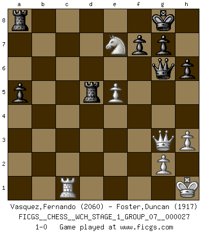 Last move : 1-0 2023 November 1 16:27:48 [Event "FICGS__CHESS__WCH_STAGE_1_GROUP_07__000027"] [Site "FICGS"] [Date "2023.07.04"] [Round "1"] [White "Vasquez,Fernando"] [Black "Foster,Duncan"] [Result "1-0"] [WhiteElo "2060"] [BlackElo "1917"] 1.e4 c6 2.d4 d5 3.e5 Bf5 4.Nf3 e6 5.Be2 h6 6.O-O Ne7 7.Nbd2 Bh7 8.Nb3 Nd7 9.Bd2 Nc8 10.a4 Be7 11.a5 O-O 12.a6 bxa6 13.Ba5 Ncb6 14.Bxa6 Qb8 15.Re1 Nc4 16.Bc3 Bb4 17.Qe2 Bxc3 18.bxc3 Qc7 19.Bxc4 dxc4 20.Na5 Nb6 21.Nd2 c5 22.Ndxc4 Nxc4 23.Nxc4 Rfd8 24.Red1 cxd4 25.cxd4 Rac8 26.Nd6 Qxc2 27.Qe1 Ra8 28.d5 exd5 29.Rxd5 Bg6 30.Rc1 Qb3 31.Qd2 Qb6 32.Kh1 a5 33.f4 Bh5 34.h3 Bg6 35.f5 Bh7 36.Qe1 Bxf5 37.Nxf5 Rxd5 38.Qg3 Qg6 39.Ne7+ 1-0 Follow this game move after move (download)At this time Fischer is simply a level above all the best Chessplayers in the world. (John Jacobs) Im Schach gibt es keinen Platz für Galanterie. (Irving Chernev) Nunca nadie ha ganado una partida de Ajedrez rindiendose. (Unknown) Des idées, des idées, j'en ai cent, j'en ai mille. Des bonnes, des mauvaises, applicables, irréalisables... Il suffit de faire le tri ! (Roos) Wawaweewa ! (Borat: Cultural learnings of America for make benefit glorious nation of Kazakhstan)