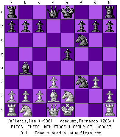Last move : 0-1 2023 August 24 12:51:41 [Event "FICGS__CHESS__WCH_STAGE_1_GROUP_07__000027"] [Site "FICGS"] [Date "2023.07.04"] [Round "1"] [White "Jefferis,Des"] [Black "Vasquez,Fernando"] [Result "0-1"] [WhiteElo "0986"] [BlackElo "2060"] 1.e4 e5 2.g3 d5 3.Bg2 dxe4 4.Bxe4 Nf6 5.Bg2 Nc6 6.d3 Bg4 7.Ne2 Bb4+ 8.Bd2 Nd4 9.f3 Bxf3 10.Bxf3 Nxf3+ 0-1 This chess game has been lost on time (started : 2023.07.04 15:4:33) Follow this game move after move (download)In a gambit you give up a Pawn for the sake of getting a lost game. (Samuel Standige Boden) Modernes Schach sorgt sich zuviel um Dinge wie Bauernstruktur usw. Vergessen Sie das, Schachmatt beendet das Spiel! (Nigel Short) Tu eres para mi la Reina en d8 y yo soy el Peón en d7!!. (GM Eduard Gufeld) Le temps de noter son nom sur la feuille de partie, j'étais déjà en zeitnot ! D'un modeste amateur apparié lors de la première ronde d'un open contre le grand-maître Azmaïparashvili. Hello Thibault, if I have had a plan (and I had one, I hope), I have forgotten it during the last week... - Hello Heinz-Georg. What do you mean a plan ? (Anonymous players, during a Big Chess game)