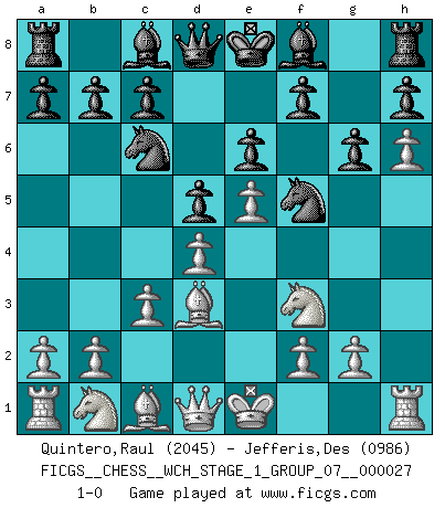 Last move : 1-0 2023 August 21 22:16:46 [Event "FICGS__CHESS__WCH_STAGE_1_GROUP_07__000027"] [Site "FICGS"] [Date "2023.07.04"] [Round "1"] [White "Quintero,Raul"] [Black "Jefferis,Des"] [Result "1-0"] [WhiteElo "2045"] [BlackElo "0986"] 1.Nf3 g6 2.e4 Bg7 3.d4 e6 4.Bd3 Ne7 5.h4 d5 6.e5 Nbc6 7.h5 Nf5 8.h6 Bf8 9.c3 1-0 This chess game has been lost on time (started : 2023.07.04 15:4:33) Follow this game move after move (download)On the chessboard, lies and hypocrisy do not survive long. (Emanuel Lasker) Ich verstehe Aljechins Kombinationen ganz gut; aber woher er diese Angriffschancen bekommt und wie er die Eröffnung behandelt das ist für mich ein Buch mit sieben Siegeln. (Rudolf Spielmann) Evita las multitudes. Haz independientemente tu propio razonamiento. Trata de ser el jugador de Ajedrez, no la pieza de Ajedrez. (Ralph Charell) Les échecs sont un jeu par leur forme, un art par leur essence et une science par sa difficulté d'acquisition. Ils peuvent vous procurer autant de plaisir qu'un bon livre ou une belle musique, mais vous n'aurez une réelle joie que si vous arrivez à bien jouer. (Tigran Petrosian) A woman without a man is like a fish without a bicycle. (Gloria Steinem)