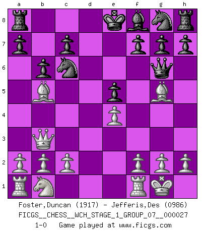 Last move : 1-0 2023 August 23 12:18:37 [Event "FICGS__CHESS__WCH_STAGE_1_GROUP_07__000027"] [Site "FICGS"] [Date "2023.07.04"] [Round "1"] [White "Foster,Duncan"] [Black "Jefferis,Des"] [Result "1-0"] [WhiteElo "1917"] [BlackElo "0986"] 1.e4 e5 2.Nf3 d6 3.d4 Bg4 4.dxe5 Bxf3 5.Qxf3 dxe5 6.Bc4 Qf6 7.Qb3 b6 8.O-O Nc6 9.Bg5 Qg6 10.Bb5 1-0 This chess game has been lost on time (started : 2023.07.04 15:4:33) Follow this game move after move (download)Only sissies Castle. (Rob Sillars) Besser ein falscher Plan, logisch durchgeführt, als gar kein Plan. (Viktor Kortschnoi) La partida mas dura de ganar es una partida ganada. (Emanuel Lasker) Il n'y a plus de joueurs du niveau de Jacob Murray dont la seule quête est le beau jeu, le plaisir de voir les pièces construire quelque chose. Sur 10 idées à la minute, 9 seront sans intérêt, la dernière s'avèrera géniale. (Christian Bauer) I just play for fun. (Anna Kournikova)